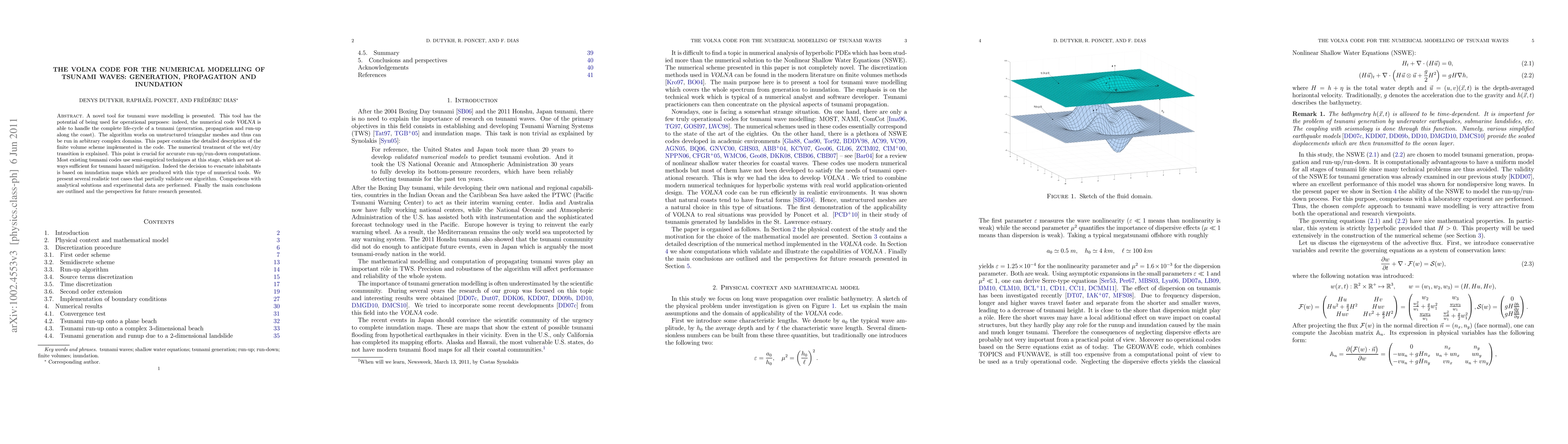 The paper presents the VOLNA code, a numerical tool for modeling the complete life-cycle of a tsunami, including generation, propagation, and inundation, using unstructured triangular meshes to handle complex domains. It details a finite volume scheme with a strong stability focus, especially for hyperbolic PDEs with discontinuous solutions.