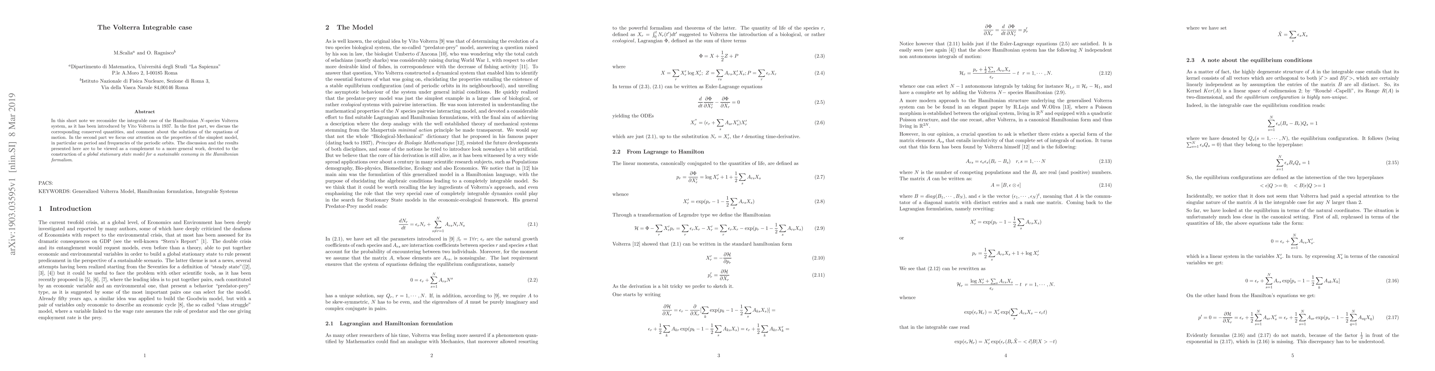 In this short note we reconsider the integrable case of the Hamiltonian N-species Volterra system, as it has been introduced by Vito Volterra in 1937. In the first part, we discuss the corresponding conserved quantities, and comment about the solutions of the equations of motion. In the second part we focus our attention on the properties of the simplest model, in particular on period and frequencies of the periodic orbits. The discussion and the results presented here are to be viewed as a complement to a more general work, devoted to the construction of "a global stationary state model for a sustainable economy in the Hamiltonian formalism".