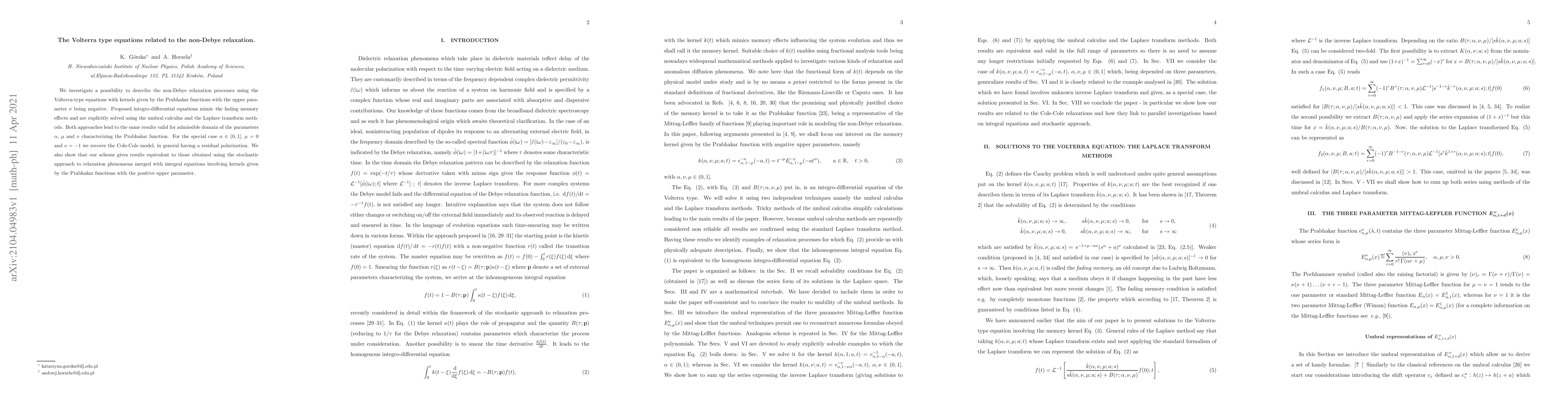 The paper proposes a new approach to describing non-Debye relaxation processes using Volterra-type equations with Prabhakar functions, mimicking fading memory effects and recovering the Cole-Cole model under specific conditions.