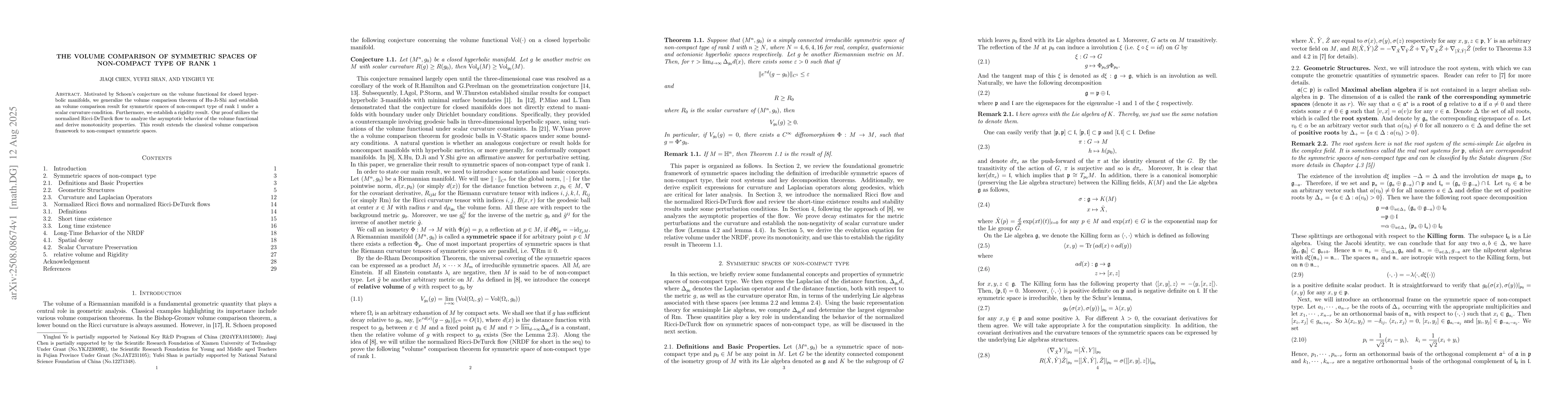 Motivated by Schoen's conjecture on the volume functional for closed hyperbolic manifolds, we generalize the volume comparison theorem of Hu-Ji-Shi and establish an volume comparison result for symmetric spaces of non-compact type of rank 1 under a scalar curvature condition. Furthermore, we establish a rigidity result. Our proof utilizes the normalized Ricci-DeTurck flow to analyze the asymptotic behavior of the volume functional and derive monotonicity properties. This result extends the classical volume comparison framework to non-compact symmetric spaces.