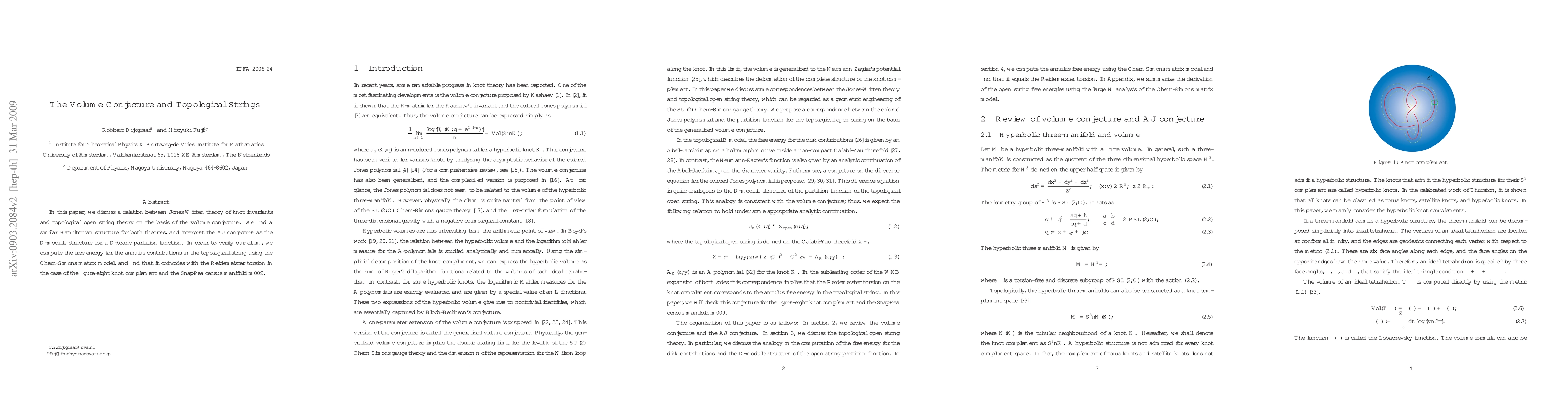 The paper establishes a connection between Jones-Witten theory and topological open string theory via the volume conjecture, demonstrating a shared Hamiltonian structure and interpreting the AJ conjecture as a D-module structure for a D-brane partition function. Computational results show agreement between annulus contributions in the topological string and Reidemeister torsion for specific knot complements and manifolds.