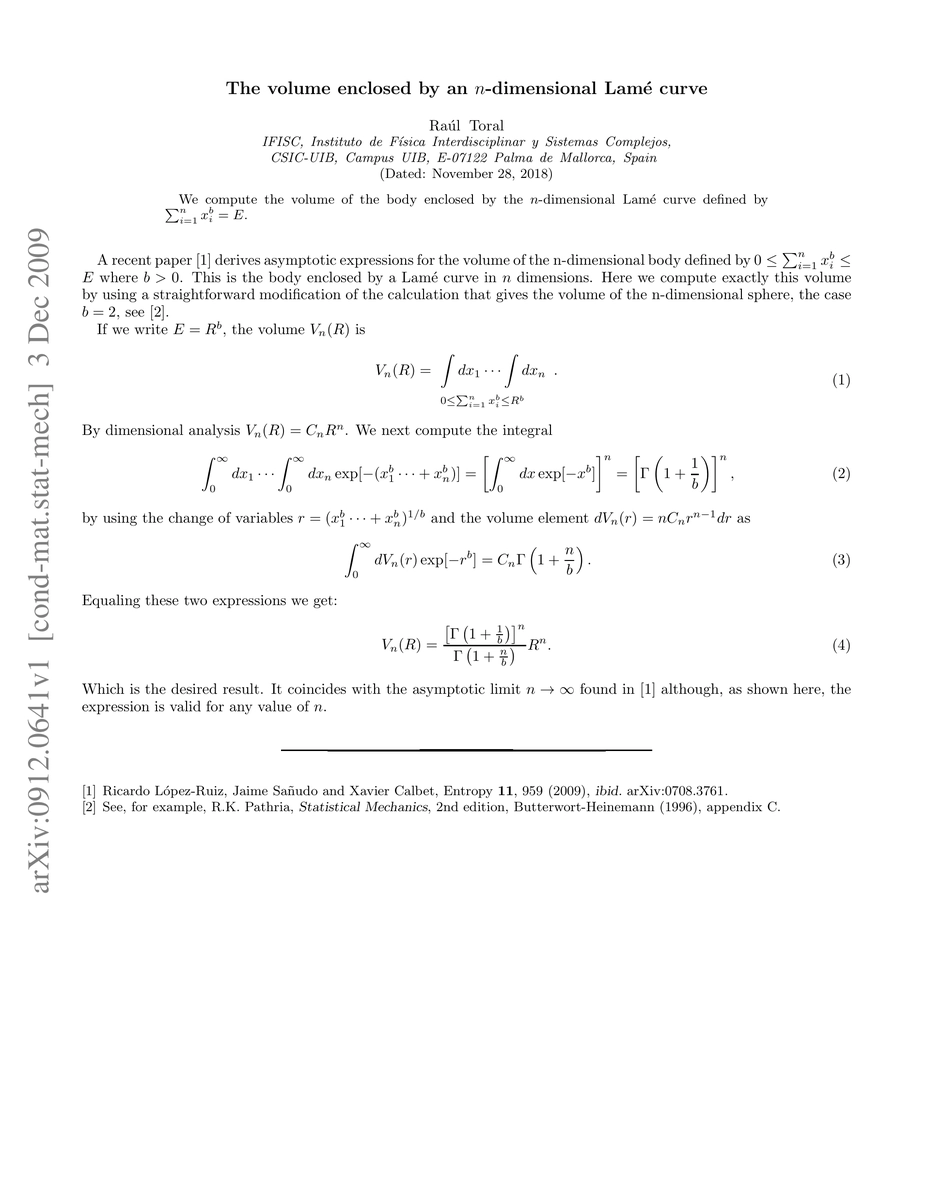 We compute the volume of the body enclosed by the $n$-dimensional Lam\'e curve defined by $\sum_{i=1}^nx_i^b= E$.