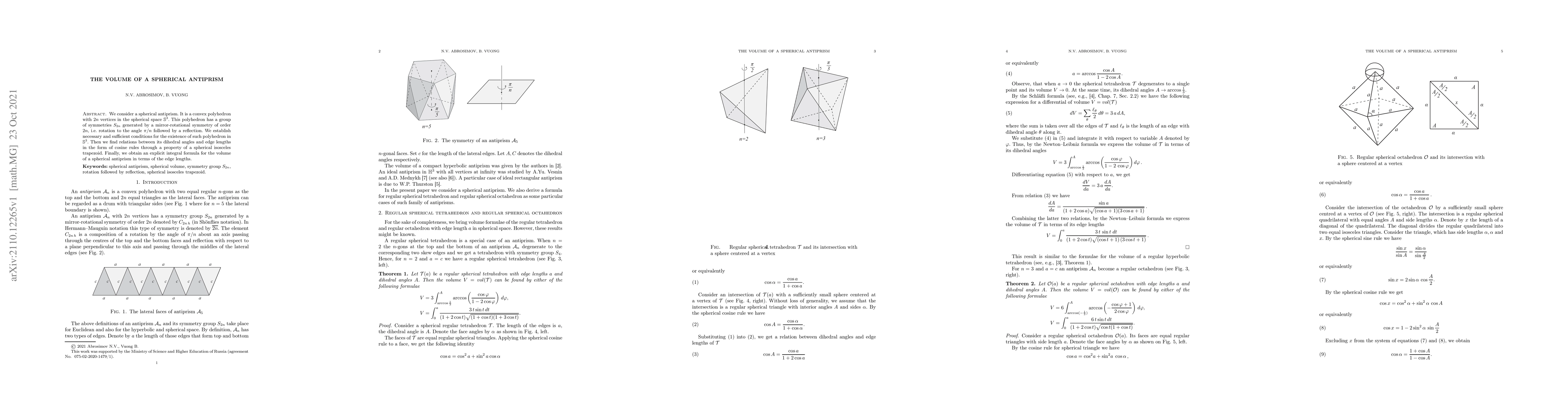 We consider a spherical antiprism. It is a convex polyhedron with $2n$ vertices in the spherical space $\mathbb{S}^3$. This polyhedron has a group of symmetries $S_{2n}$ generated by a mirror-rotational symmetry of order $2n$, i.e. rotation to the angle $\pi/n$ followed by a reflection. We establish necessary and sufficient conditions for the existence of such polyhedron in $\mathbb{S}^3$. Then we find relations between its dihedral angles and edge lengths in the form of cosine rules through a property of a spherical isosceles trapezoid. Finally, we obtain an explicit integral formula for the volume of a spherical antiprism in terms of the edge lengths.