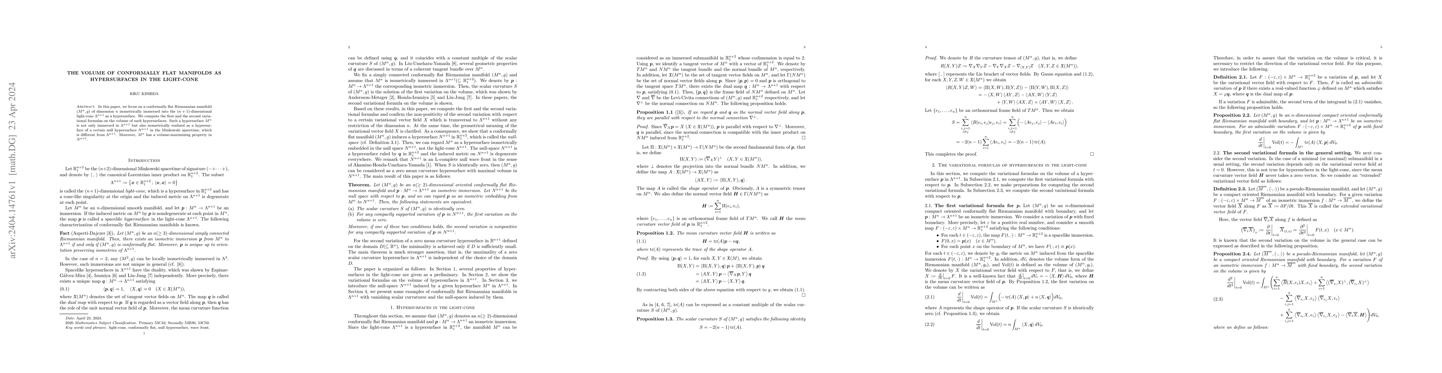 In this paper, we focus on a conformally flat Riemannian manifold $(M^n,g)$ of dimension $n$ isometrically immersed into the $(n+1)$-dimensional light-cone $\Lambda^{n+1}$ as a hypersurface. We compute the first and the second variational formulas on the volume of such hypersurfaces. Such a hypersurface $M^n$ is not only immersed in $\Lambda^{n+1}$ but also isometrically realized as a hypersurface of a certain null hypersurface $N^{n+1}$ in the Minkowski spacetime, which is different from $\Lambda^{n+1}$. Moreover, $M^n$ has a volume-maximizing property in $N^{n+1}$.
