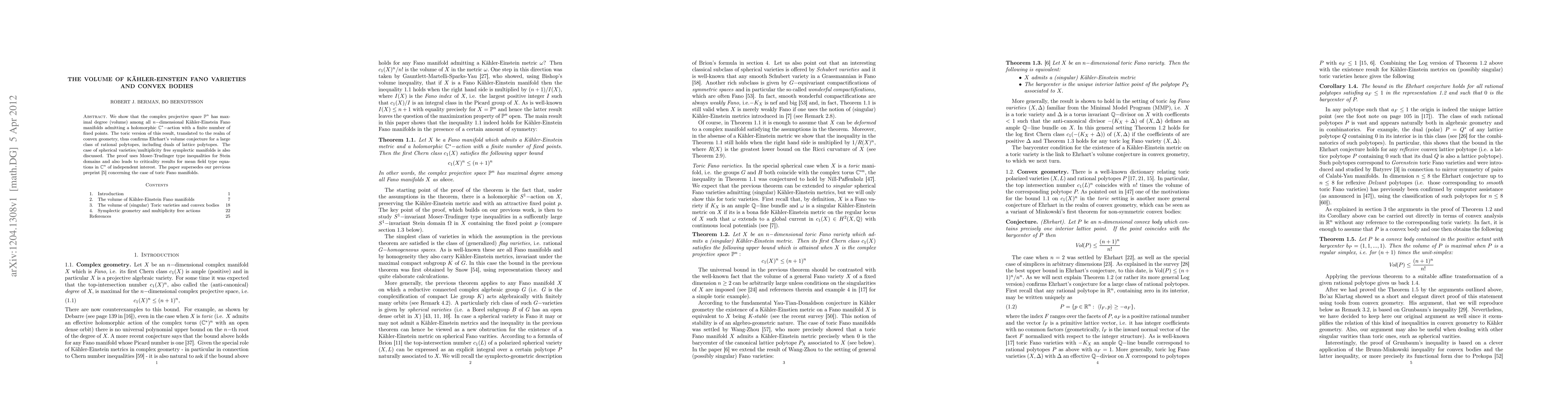 The paper proves that complex projective space has maximal volume among n-dimensional Kahler-Einstein Fano manifolds with certain properties, confirming Ehrhart's volume conjecture for a class of rational polytopes.