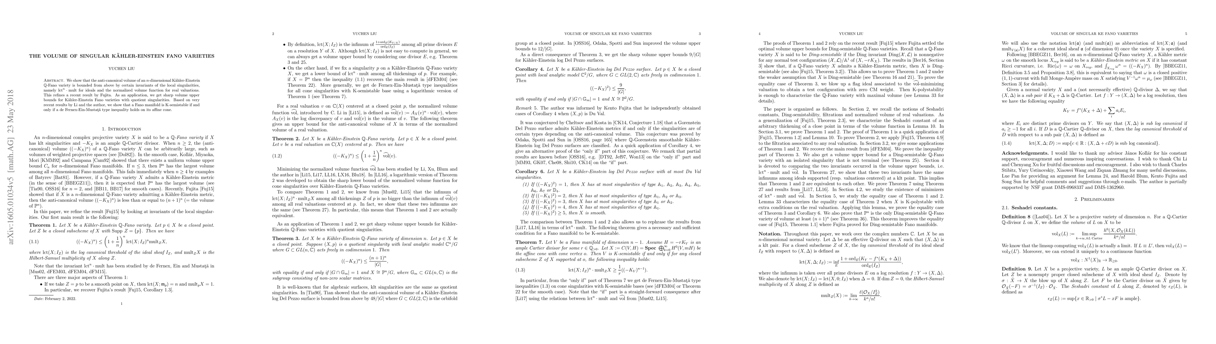 This paper establishes an upper bound for the anti-canonical volume of $n$-dimensional Kähler-Einstein $\mathbb{Q}$-Fano varieties using local singularity invariants, refining Fujita's result. It also demonstrates that K-semistability of a Fano manifold is equivalent to a specific de Fernex-Ein-Mustață inequality on its affine cone.