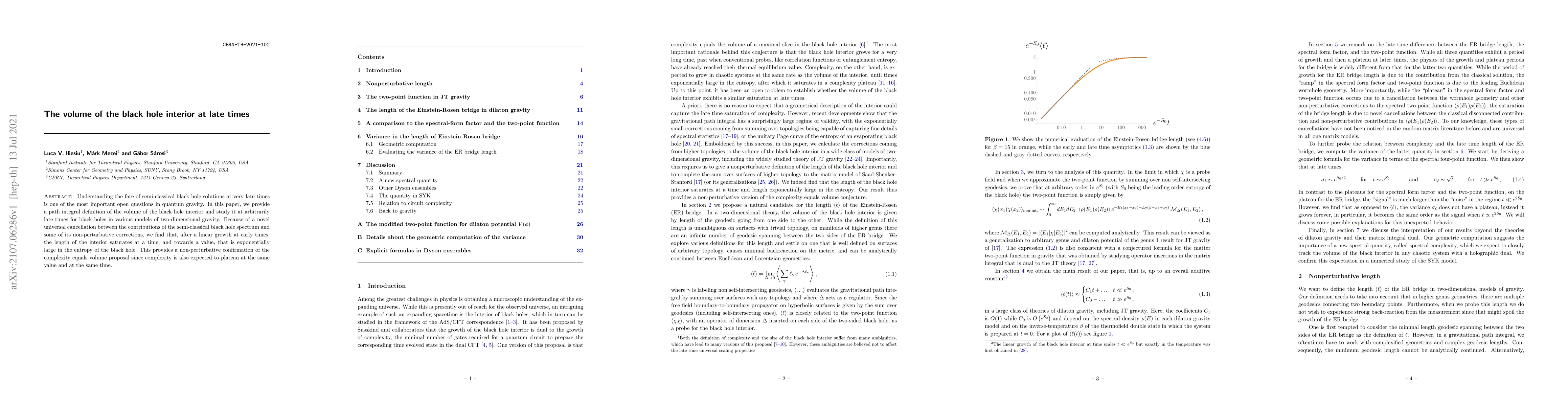 Understanding the fate of semi-classical black hole solutions at very late times is one of the most important open questions in quantum gravity. In this paper, we provide a path integral definition of the volume of the black hole interior and study it at arbitrarily late times for black holes in various models of two-dimensional gravity. Because of a novel universal cancellation between the contributions of the semi-classical black hole spectrum and some of its non-perturbative corrections, we find that, after a linear growth at early times, the length of the interior saturates at a time, and towards a value, that is exponentially large in the entropy of the black hole. This provides a non-perturbative confirmation of the complexity equals volume proposal since complexity is also expected to plateau at the same value and at the same time.
