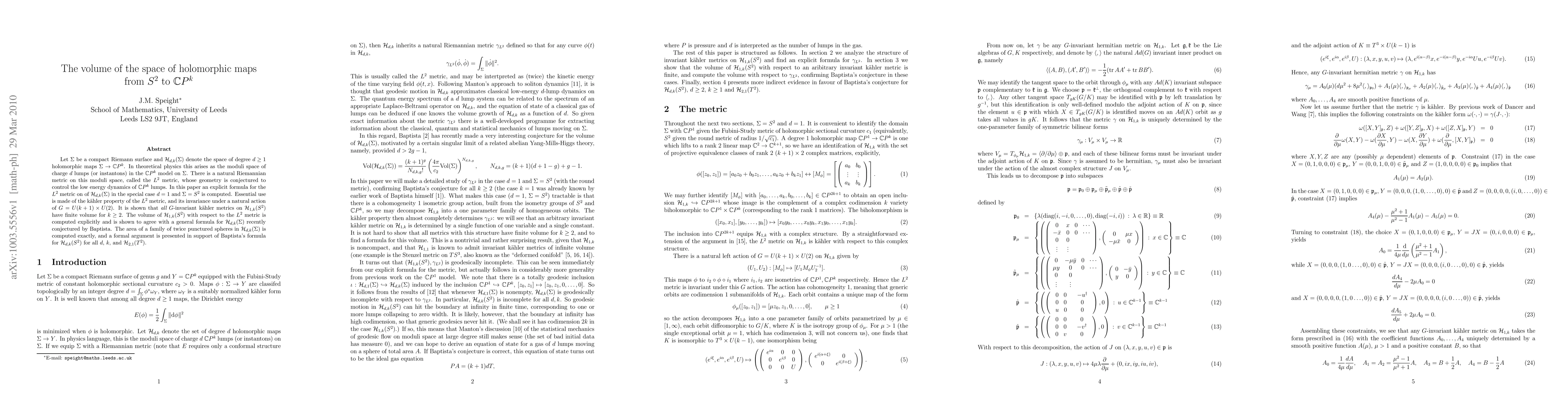 Let $\Sigma$ be a compact Riemann surface and $\h_{d,k}(\Sigma)$ denote the space of degree $d\geq 1$ holomorphic maps $\Sigma\ra \CP^k$. In theoretical physics this arises as the moduli space of charge $d$ lumps (or instantons) in the $\CP^k$ model on $\Sigma$. There is a natural Riemannian metric on this moduli space, called the $L^2$ metric, whose geometry is conjectured to control the low energy dynamics of $\CP^k$ lumps. In this paper an explicit formula for the $L^2$ metric on of $\h_{d,k}(\Sigma)$ in the special case $d=1$ and $\Sigma=S^2$ is computed. Essential use is made of the k\"ahler property of the $L^2$ metric, and its invariance under a natural action of $G=U(k+1)\times U(2)$. It is shown that {\em all} $G$-invariant k\"ahler metrics on $\h_{1,k}(S^2)$ have finite volume for $k\geq 2$. The volume of $\h_{1,k}(S^2)$ with respect to the $L^2$ metric is computed explicitly and is shown to agree with a general formula for $\h_{d,k}(\Sigma)$ recently conjectured by Baptista. The area of a family of twice punctured spheres in $\h_{d,k}(\Sigma)$ is computed exactly, and a formal argument is presented in support of Baptista's formula for $\h_{d,k}(S^2)$ for all $d$, $k$, and $\h_{2,1}(T^2)$.