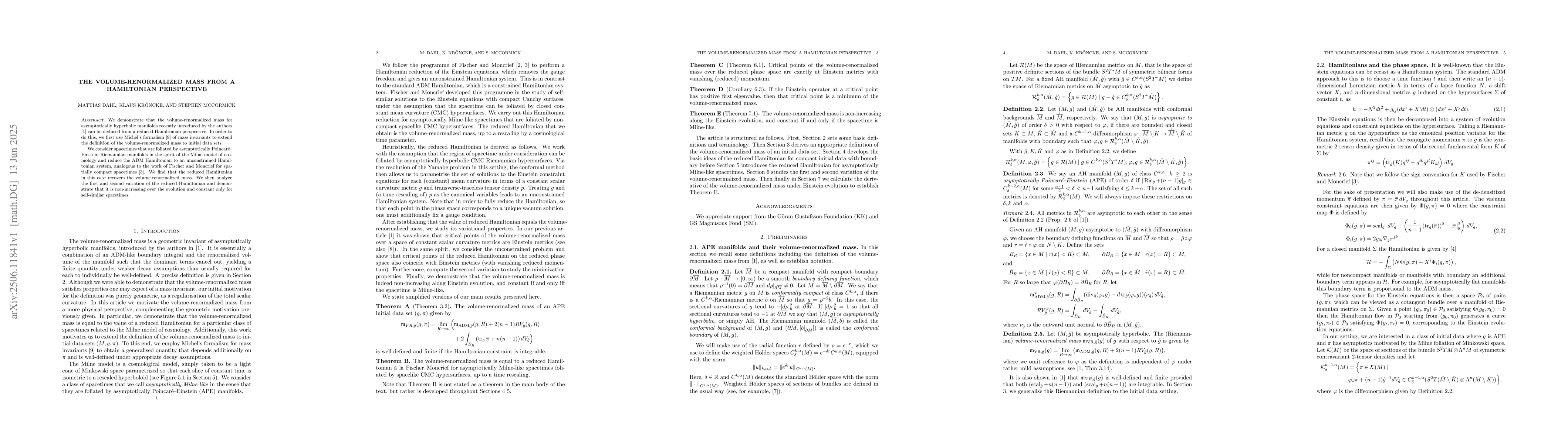 We demonstrate that the volume-renormalized mass for asymptotically hyperbolic manifolds recently introduced by the authors can be deduced from a reduced Hamiltonian perspective. In order to do this, we first use Michel's formalism of mass invariants to extend the definition of the volume-renormalized mass to initial data sets. We consider spacetimes that are foliated by asymptotically Poincar\'e--Einstein Riemannian manifolds in the spirit of the Milne model of cosmology and reduce the ADM Hamiltonian to an unconstrained Hamiltonian system, analogous to the work of Fischer and Moncrief for spatially compact spacetimes. We find that the reduced Hamiltonian in this case recovers the volume-renormalized mass. We then analyze the first and second variation of the reduced Hamiltonian and demonstrate that it is non-increasing over the evolution and constant only for self-similar spacetimes.