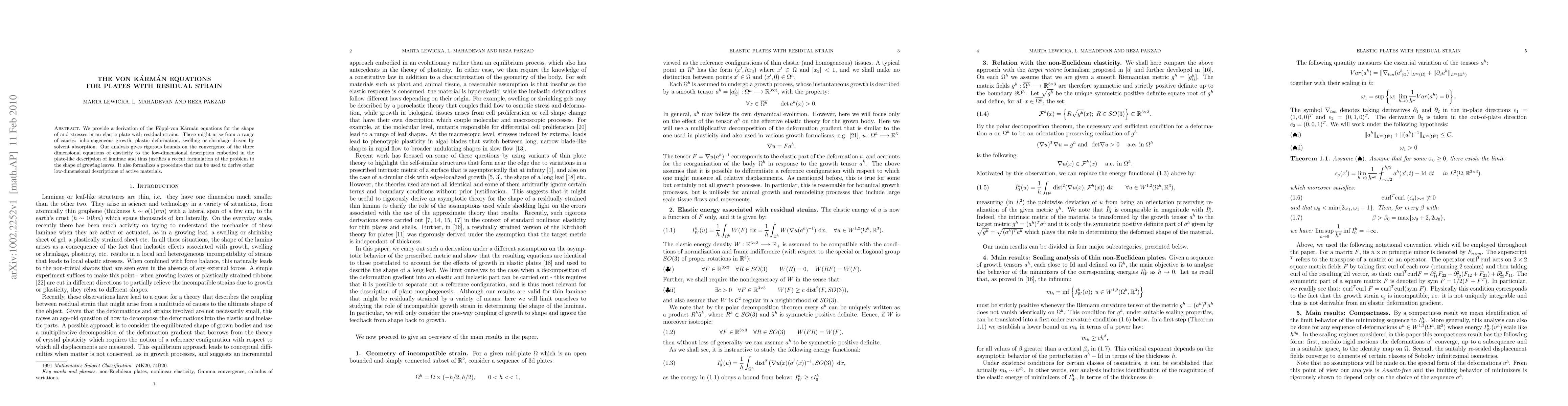 We provide a derivation of the Foppl-von Karman equations for the shape of and stresses in an elastic plate with residual strains. These might arise from a range of causes: inhomogeneous growth, plastic deformation, swelling or shrinkage driven by solvent absorption. Our analysis gives rigorous bounds on the convergence of the three dimensional equations of elasticity to the low-dimensional description embodied in the plate-like description of laminae and thus justifies a recent formulation of the problem to the shape of growing leaves. It also formalizes a procedure that can be used to derive other low-dimensional descriptions of active materials.