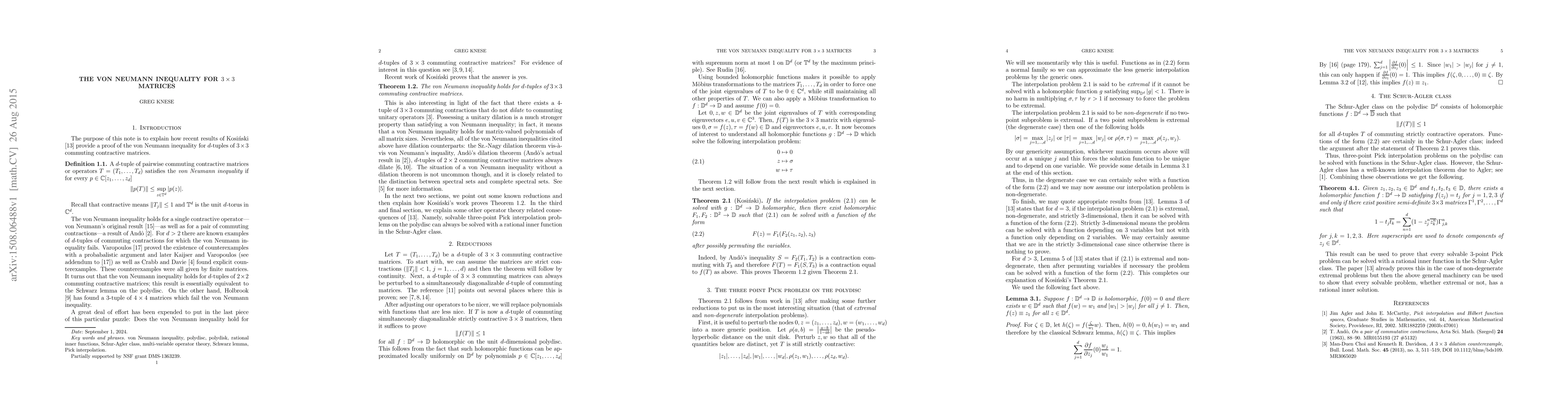 Kosiński's work establishes the von Neumann inequality for 3x3 matrices through detailed analysis of the three point Pick interpolation problem on the polydisc, with the main result attributed to his contributions. This research uses standard reductions to provide a comprehensive explanation.