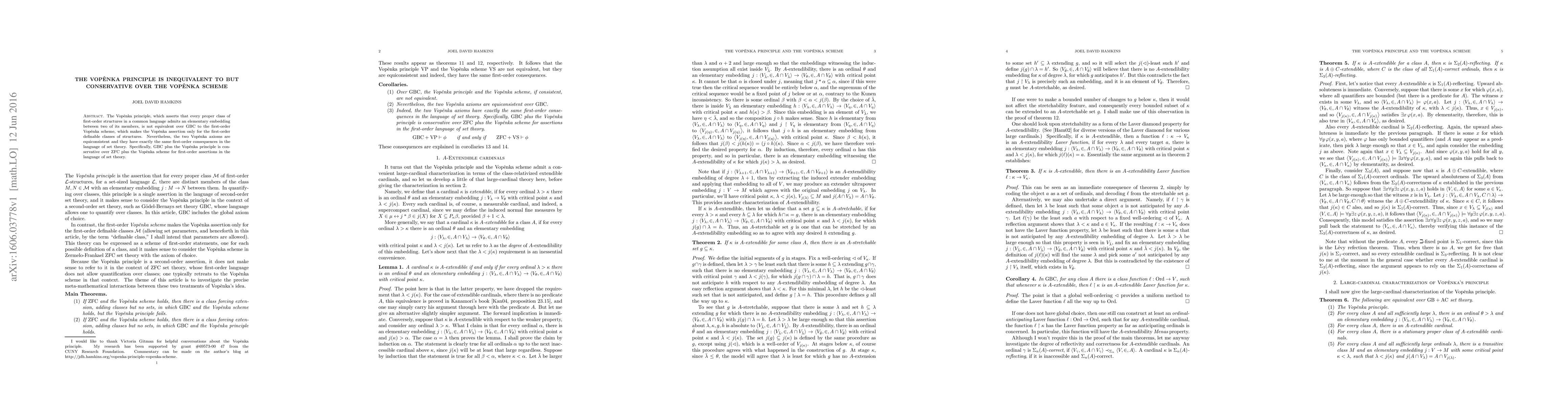 The Vopénka principle is equivalent to the first-order Vopénka scheme in set theory implications but not in general first-order logic, while being conservative over one over the other in specific contexts.