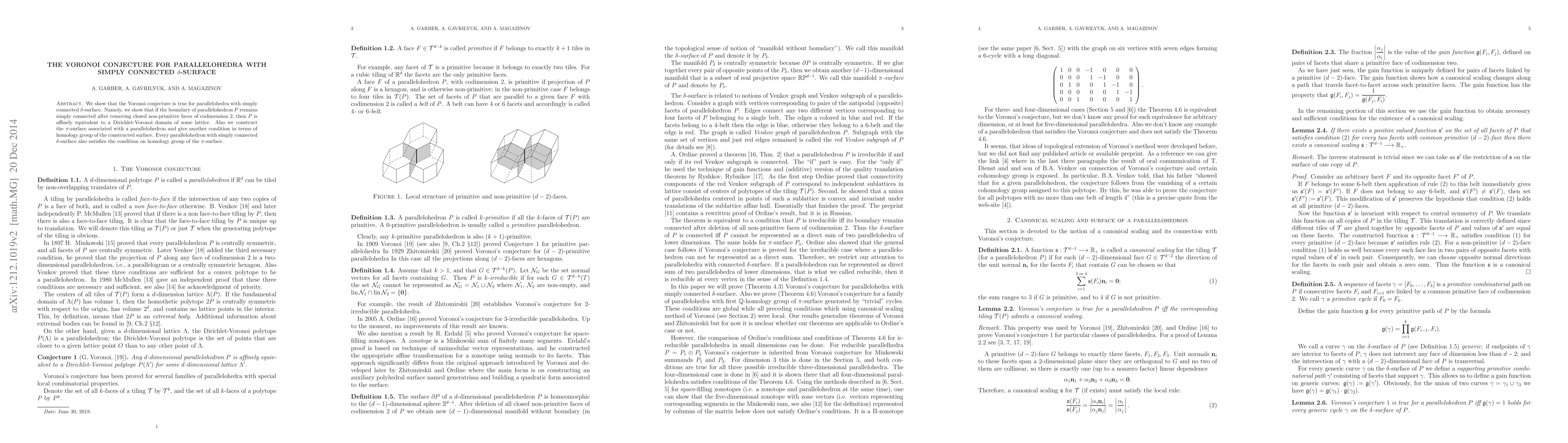 We show that the Voronoi conjecture is true for parallelohedra with simply connected $\delta$-surface. Namely, we show that if the boundary of parallelohedron $P$ remains simply connected after removing closed non-primitive faces of codimension 2, then $P$ is affinely equivalent to a Dirichlet-Voronoi domain of some lattice. Also we construct the $\pi$-surface associated with a parallelohedron and give another condition in terms of homology group of the constructed surface. Every parallelohedron with simply connected $\delta$-surface also satisfies the condition on homology group of the $\pi$-surface.
