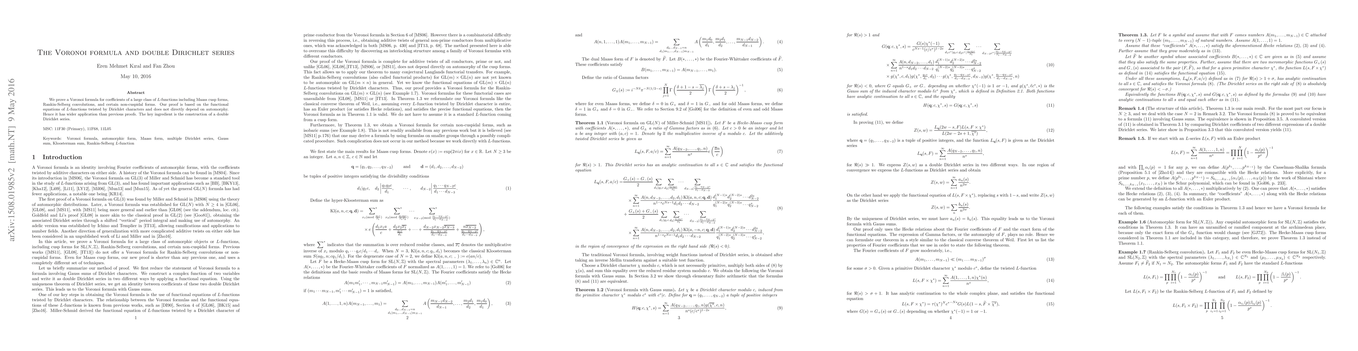 We prove a Voronoi formula for coefficients of a large class of $L$-functions including Maass cusp forms, Rankin-Selberg convolutions, and certain isobaric sums. Our proof is based on the functional equations of $L$-functions twisted by Dirichlet characters and does not directly depend on automorphy. Hence it has wider application than previous proofs. The key ingredient is the construction of a double Dirichlet series.