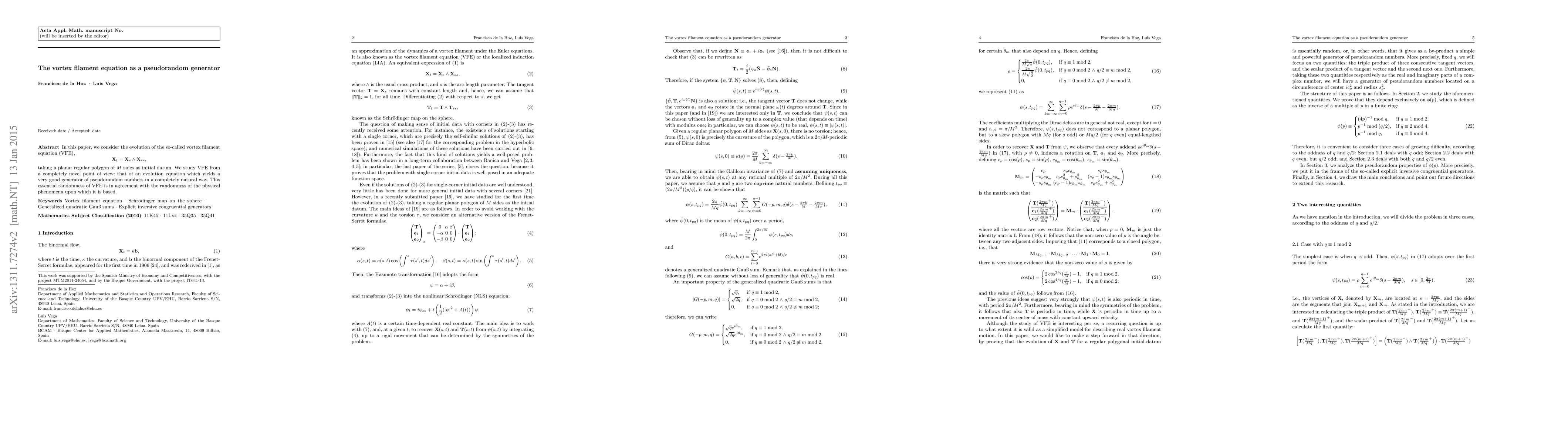 This paper explores the vortex filament equation (VFE) as a novel pseudorandom number generator, demonstrating its inherent randomness aligns with the stochastic nature of the physical phenomena it models, starting from a planar regular polygon as initial data.