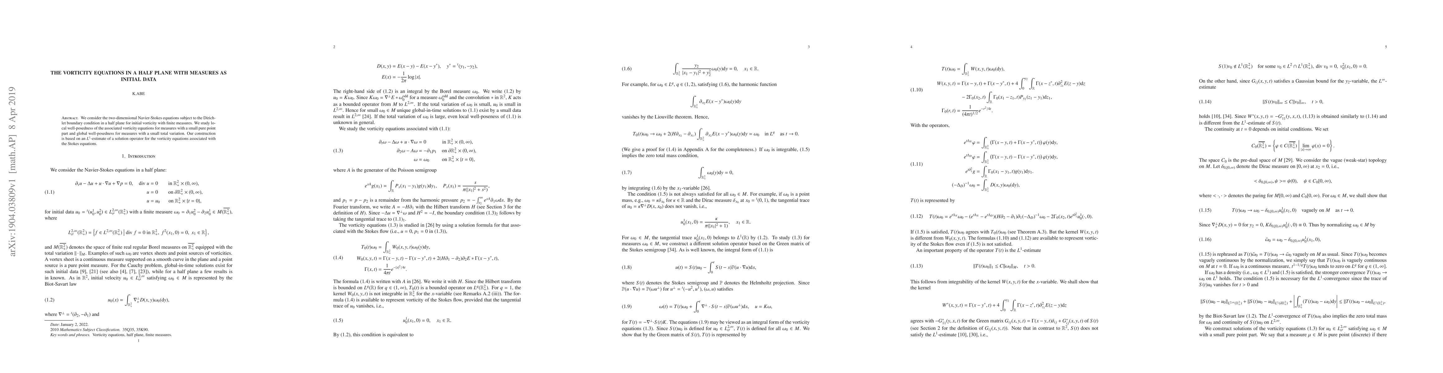 This paper investigates the local well-posedness of the two-dimensional Navier-Stokes equations in a half plane with initial vorticity represented as finite measures, focusing on cases with a small pure point part. It also explores global well-posedness for measures with small total variation, utilizing an $L^{1}$-estimate of the solution operator linked to the Stokes equations.