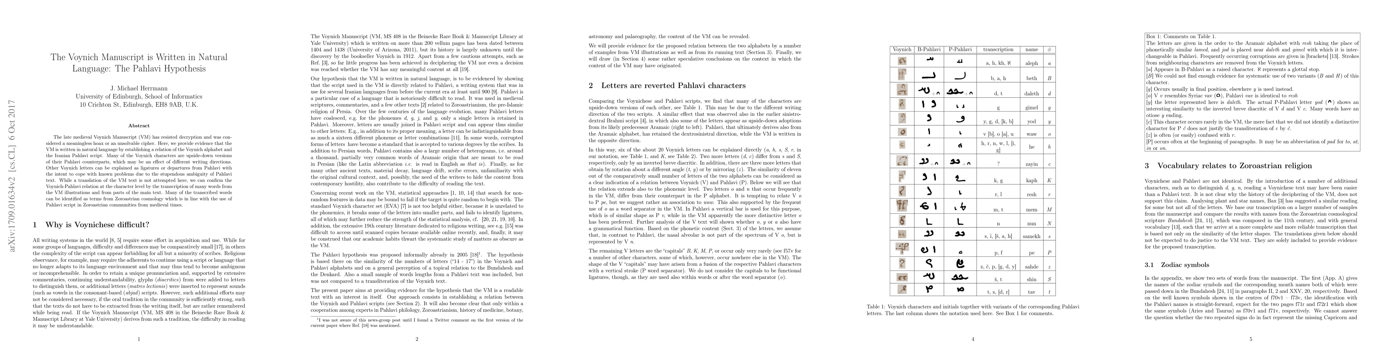 The Voynich Manuscript, long considered an unsolvable cipher, is hypothesized to be written in the Iranian Pahlavi script, with many characters being upside-down versions or ligatures of Pahlavi letters, suggesting a natural language connection to Zoroastrian cosmology. The study establishes a character-level relation between Voynich and Pahlavi scripts.