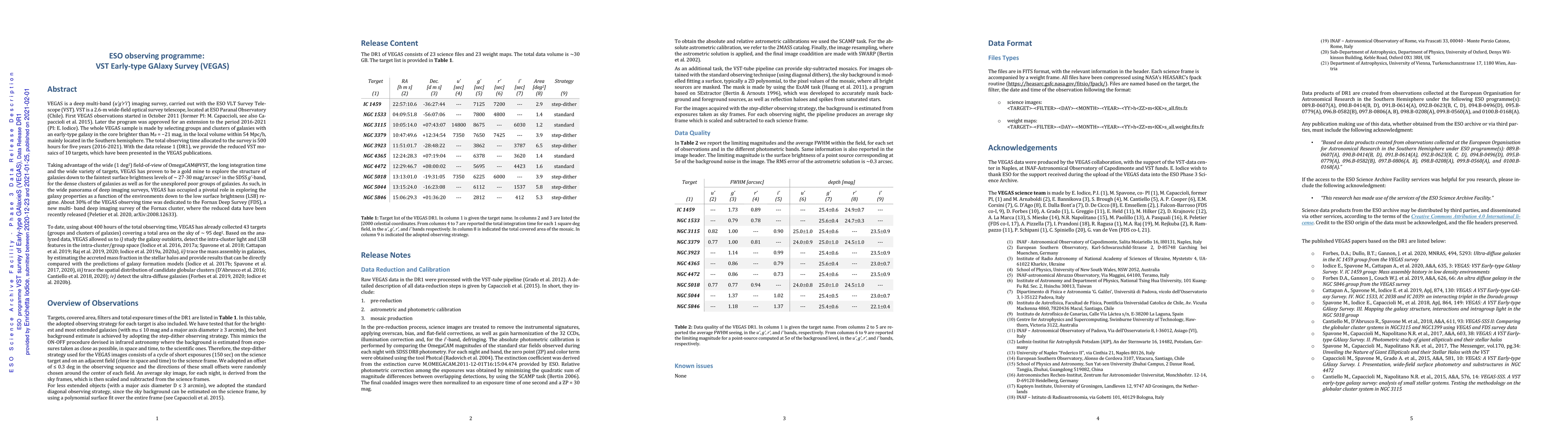 The VEGAS survey, conducted with the VST telescope, has released its first data set, covering 43 galaxy clusters and groups over 95 square degrees. The data enables detailed studies of galaxy outskirts, intra-cluster light, mass assembly in galaxies, globular cluster distribution, and ultra-diffuse galaxies.