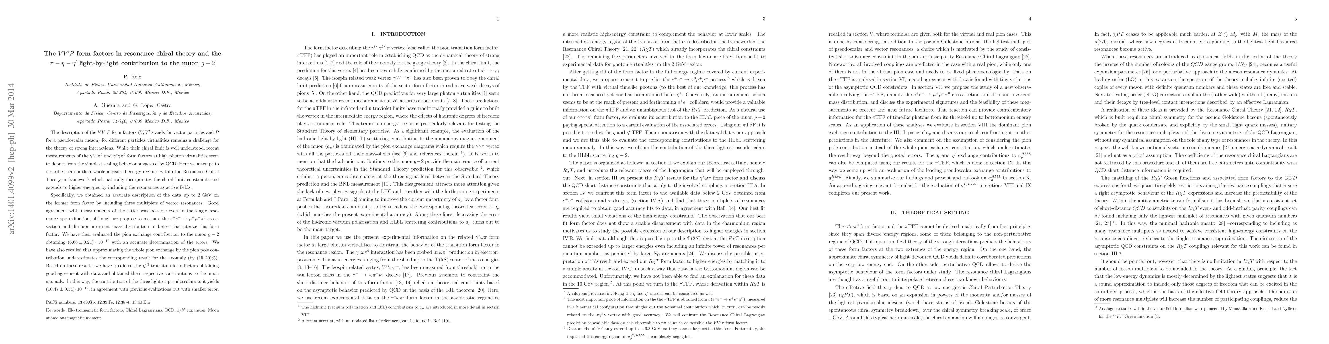 The description of the VV'P form factors (V,V' stands for vector particles and P for a pseudoscalar meson) for different particles virtualities remains a challenge for the theory of strong interactions. While their chiral limit is well understood, recent measurements of the gamma^* omega pi^0 and gamma^* gamma pi^0 form factors at high photon virtualities seem to depart from the simplest scaling behavior suggested by QCD. Here we attempt to describe them in their whole measured energy regimes within the Resonance Chiral Theory, a framework which naturally incorporates the chiral limit constraints and extends to higher energies by including the resonances as active fields. Specifically, we obtained an accurate description of the data up to 2 GeV on the former form factor by including three multiplets of vector resonances. Good agreement with measurements of the latter was possible even in the single resonance approximation, although we propose to measure the e^+e^- to mu^+mu^-pi^0 cross-section and di-muon invariant mass distribution to better characterize this form factor. We have then evaluated the pion exchange contribution to the muon g-2 obtaining (6.66\pm0.21)x10^{-10} with an accurate determination of the errors. We have also recalled that approximating the whole pion exchange by the pion pole contribution underestimates the corresponding result for the anomaly (by (15,20)%). Based on these results, we have predicted the eta^(\prime) transition form factors obtaining good agreement with data and obtained their respective contributions to the muon anomaly. In this way, the contribution of the three lightest pseudoscalars to it yields (10.47\pm0.54)x10^{-10}, in agreement with previous evaluations but with smaller error.