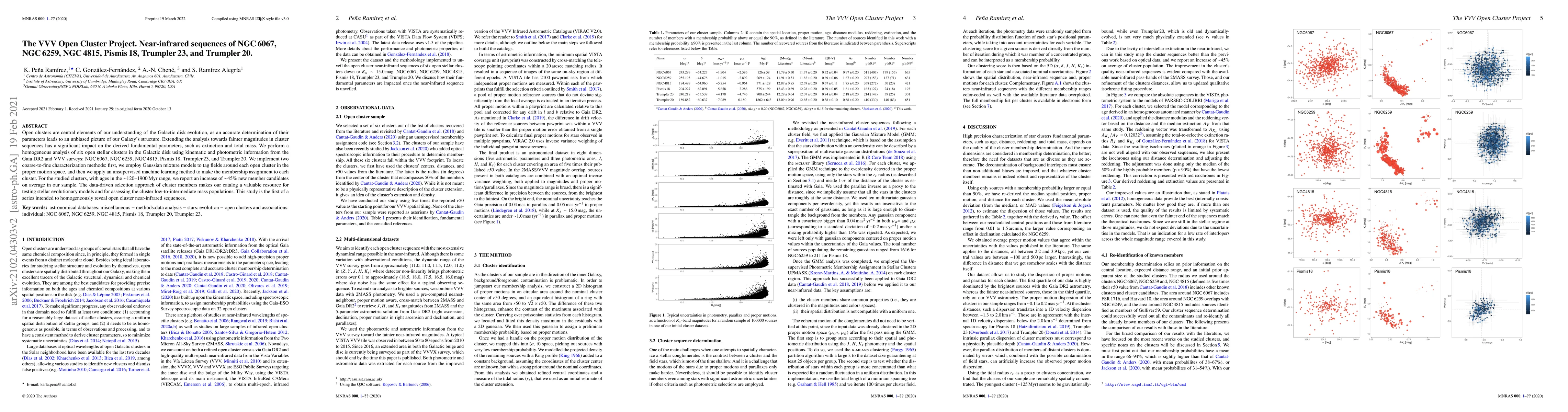 Open clusters are central elements of our understanding of the Galactic disk evolution, as an accurate determination of their parameters leads to an unbiased picture of our Galaxy's structure. Extending the analysis towards fainter magnitudes in cluster sequences has a significant impact on the derived fundamental parameters, such as extinction and total mass. We perform a homogeneous analysis of six open stellar clusters in the Galactic disk using kinematic and photometric information from the Gaia DR2 and VVV surveys: NGC6067, NGC6259, NGC4815, Pismis18, Trumpler23, and Trumpler20. We implement two coarse-to-fine characterization methods: first, we employ Gaussian mixture models to tag fields around each open cluster in the proper motion space, and then we apply an unsupervised machine learning method to make the membership assignment to each cluster. For the studied clusters, with ages in the $\sim$120-1900 Myr range, we report an increase of $\sim$45 % new member candidates on average in our sample. The data-driven selection approach of cluster members makes our catalog a valuable resource for testing stellar evolutionary models and for assessing the cluster low-to-intermediate mass populations. This study is the first of a series intended to homogeneously reveal open cluster near-infrared sequences.