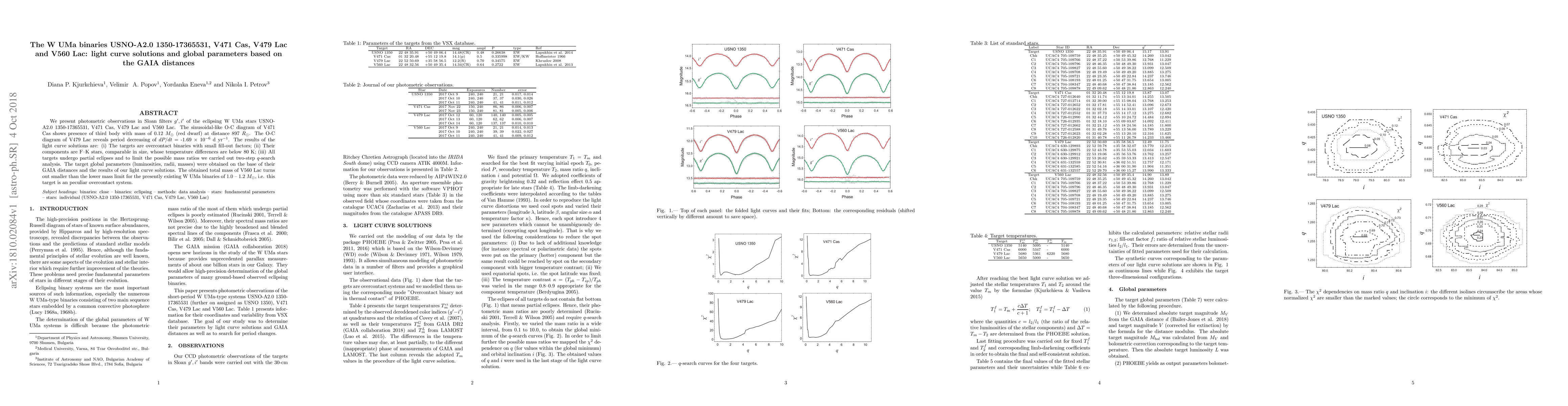 We present photometric observations in Sloan filters g', i' of the eclipsing W UMa stars USNO-A2.0 1350-17365531, V471 Cas, V479 Lac and V560 Lac. The sinusoidal-like O-C diagram of V471 Cas shows presence of third body with mass of 0.12 Msun (red dwarf) at distance 897 Rsun. The O-C diagram of V479 Lac reveals period decreasing. The results of the light curve solutions are: (i) The targets are overcontact binaries with small fill-out factors; (ii) Their components are F-K stars, comparable in size, whose temperature differences are below 80 K; (iii) All targets undergo partial eclipses and to limit the possible mass ratios we carried out two-step $q$-search analysis. The target global parameters (luminosities, radii, masses) were obtained on the base of their GAIA distances and the results of our light curve solutions. The obtained total mass of V560 Lac turns out smaller than the lower mass limit for the presently existing W UMa binaries of 1.0-1.2 Msun, i.e. this target is an peculiar overcontact system.