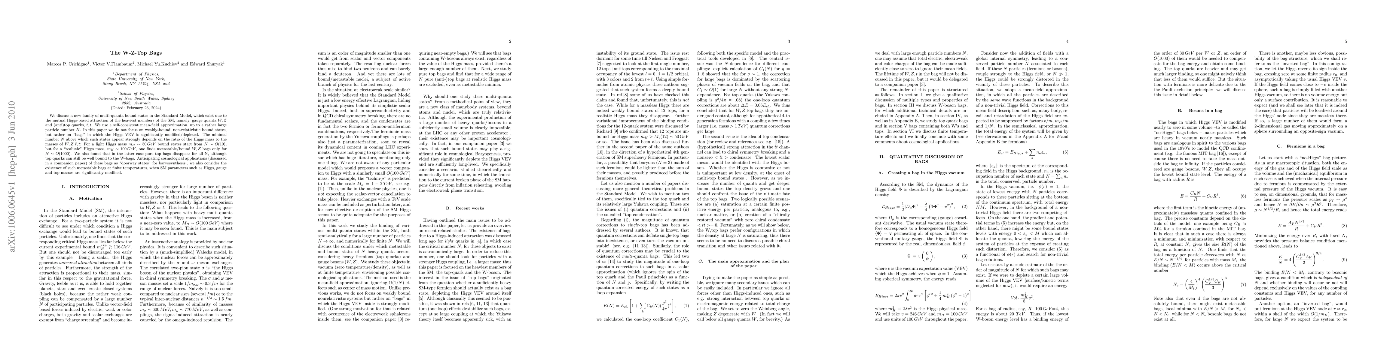 We discuss a new family of multi-quanta bound states in the Standard Model, which exist due to the mutual Higgs-based attraction of the heaviest members of the SM, namely, gauge quanta $W,Z$ and (anti)top quarks, $\bar t, t $. We use a self-consistent mean-field approximation, up to a rather large particle number $N$. In this paper we do not focus on weakly-bound, non-relativistic bound states, but rather on "bags" in which the Higgs VEV is significantly modified/depleted. The minimal number $N$ above which such states appear strongly depends on the ratio of the Higgs mass to the masses of $W,Z,\bar{t}, t $: For a light Higgs mass $m_H \sim 50\, GeV$ bound states start from $N\sim O(10)$, but for a "realistic" Higgs mass, $m_H\sim 100\, GeV$, one finds metastable/bound $W,Z$ bags only for $N\sim O(1000)$. We also found that in the latter case pure top bags disappear for all N, although top quarks can still be well bound to the W-bags. Anticipating cosmological applications (discussed in a companion paper) of these bags as "doorway states" for baryosynthesis, we also consider the existence of such metastable bags at finite temperatures, when SM parameters such as Higgs, gauge and top masses are significantly modified.