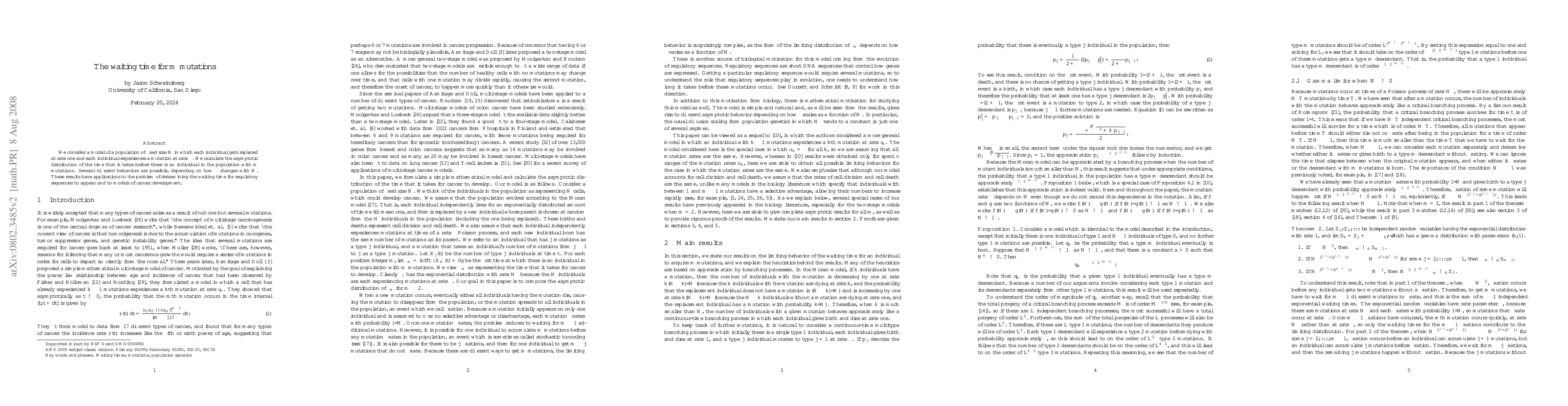 We consider a model of a population of fixed size N in which each individual gets replaced at rate one and each individual experiences a mutation at rate \mu. We calculate the asymptotic distribution of the time that it takes before there is an individual in the population with m mutations. Several different behaviors are possible, depending on how \mu changes with N. These results have applications to the problem of determining the waiting time for regulatory sequences to appear and to models of cancer development.