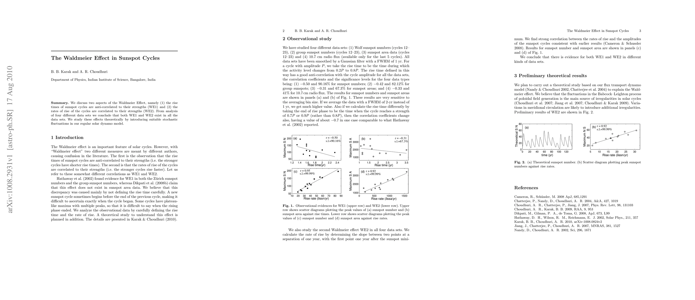 We discuss two aspects of the Waldmeier Effect, namely (1) the rise times of sunspot cycles are anti-correlated to their strengths (WE1) and (2) the rates of rise of the cycles are correlated to their strengths (WE2). From analysis of four different data sets we conclude that both WE1 and WE2 exist in all the data sets. We study these effects theoretically by introducing suitable stochastic fluctuations in our regular solar dynamo model.