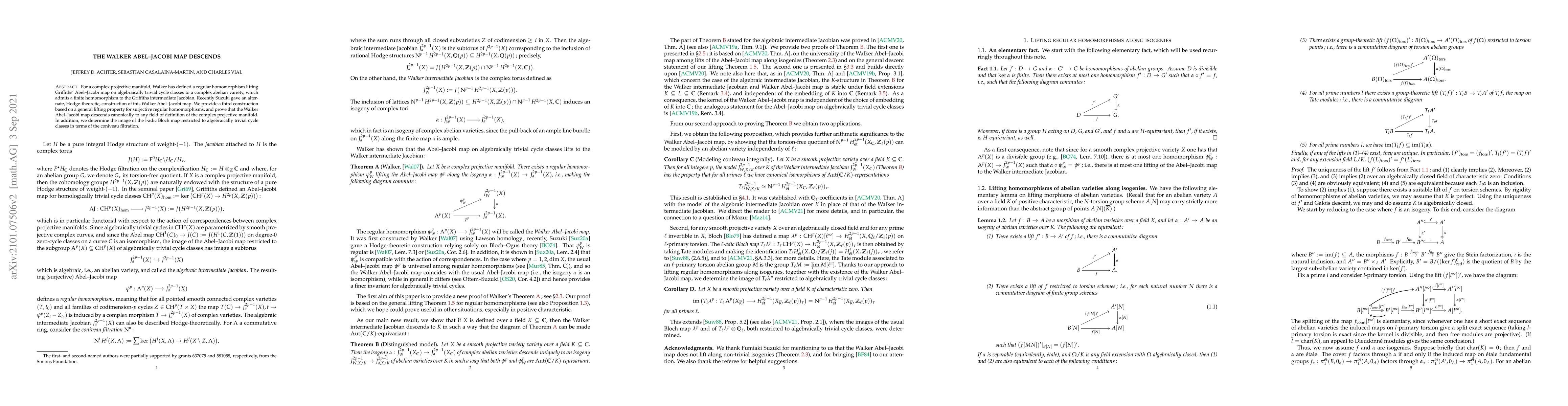 For a complex projective manifold, Walker has defined a regular homomorphism lifting Griffiths' Abel-Jacobi map on algebraically trivial cycle classes to a complex abelian variety, which admits a finite homomorphism to the Griffiths intermediate Jacobian. Recently Suzuki gave an alternate, Hodge-theoretic, construction of this Walker Abel-Jacobi map. We provide a third construction based on a general lifting property for surjective regular homomorphisms, and prove that the Walker Abel-Jacobi map descends canonically to any field of definition of the complex projective manifold. In addition, we determine the image of the l-adic Bloch map restricted to algebraically trivial cycle classes in terms of the coniveau filtration.