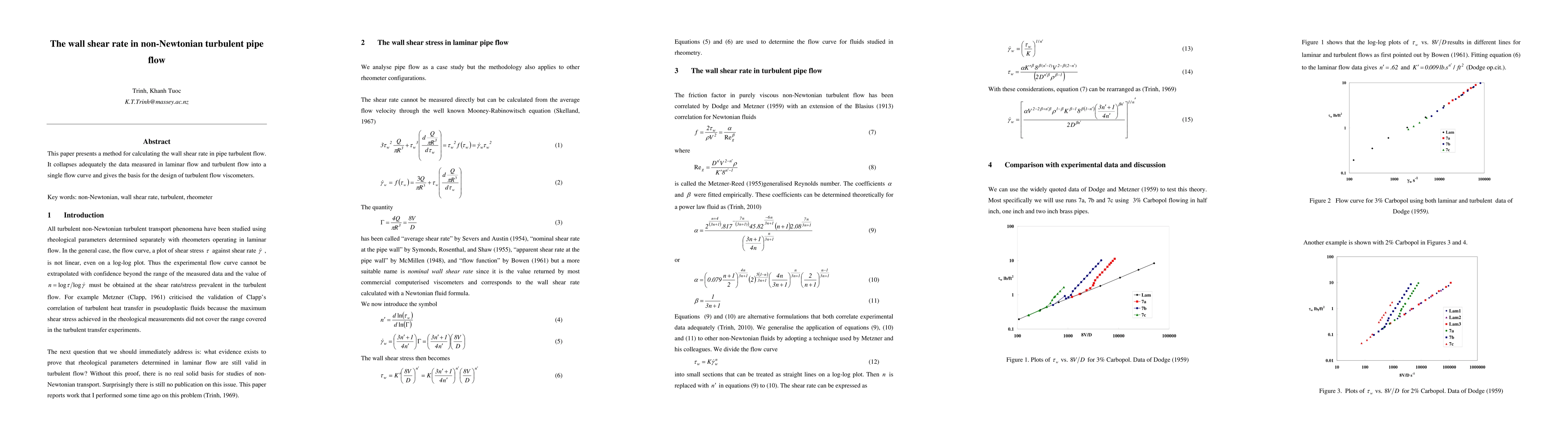 This paper develops a method to calculate the wall shear rate in turbulent pipe flow, successfully merging laminar and turbulent flow data into a unified curve, which serves as a foundation for designing turbulent flow viscometers. Keywords: non-Newtonian, wall shear rate, turbulent, rheometer.