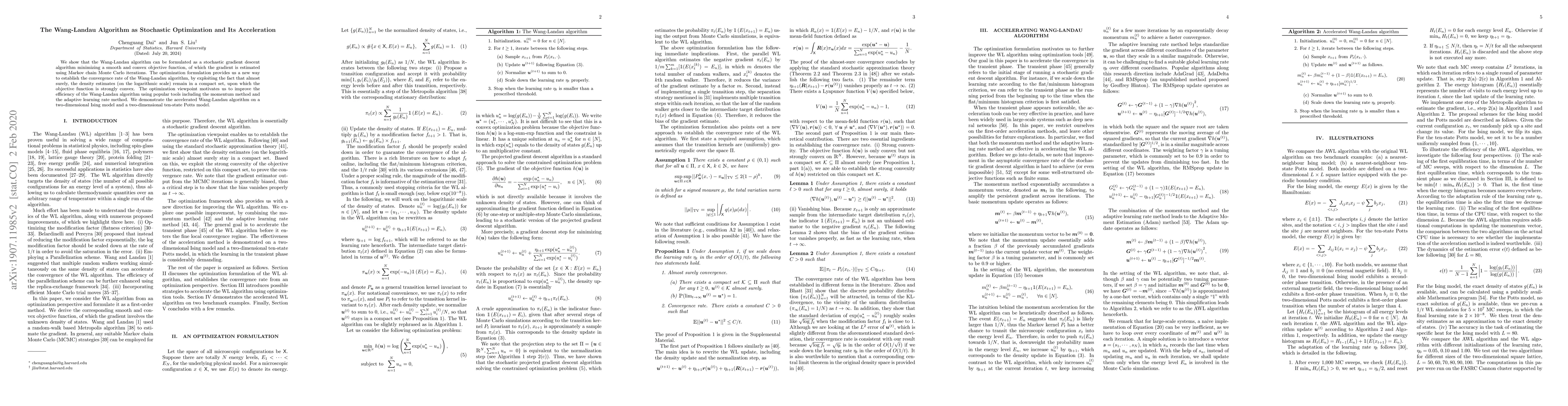 The Wang-Landau algorithm is reformulated as a stochastic gradient descent method, allowing for improved convergence rates and efficiency through techniques like momentum and adaptive learning rates. This optimization perspective is demonstrated through accelerated versions of the algorithm applied to the Ising model and Potts model.