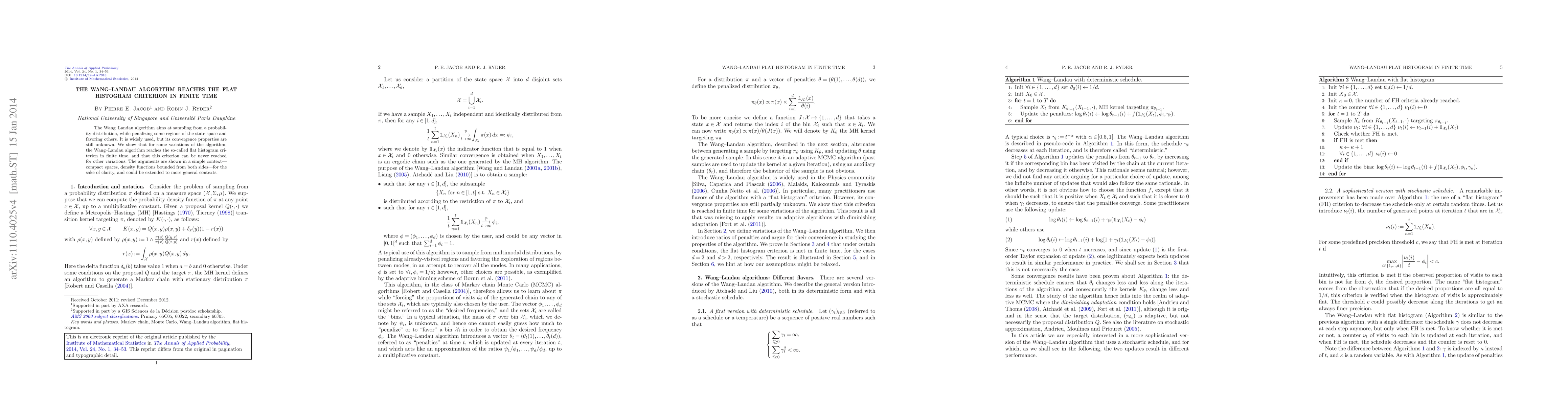 The Wang-Landau algorithm achieves the flat histogram criterion in finite time for certain variations, while other variations may never reach it. This conclusion is demonstrated in simple contexts with bounded density functions and could be generalized to broader scenarios.