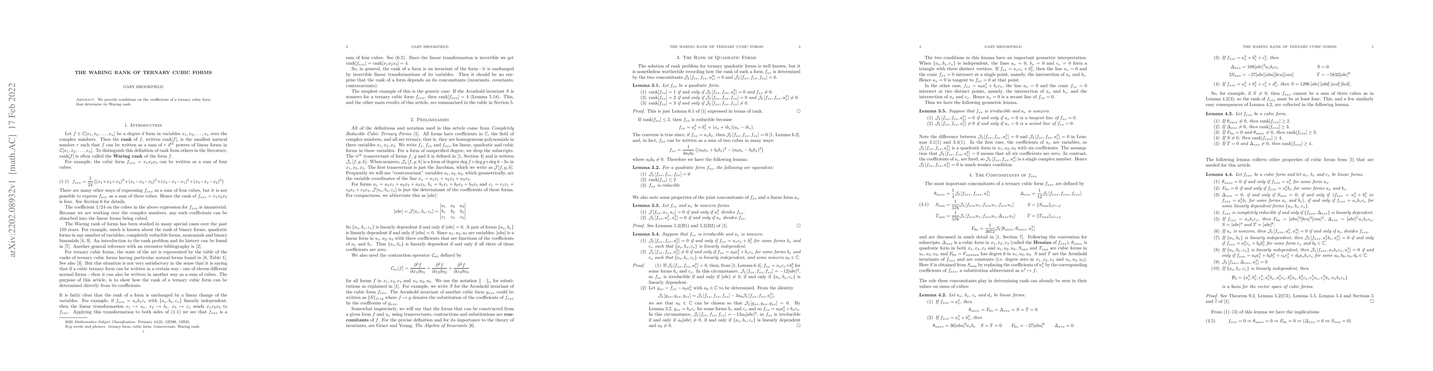 Summary: The paper establishes criteria for determining the Waring rank of ternary cubic forms based on specific properties of their coefficients. This aids in understanding the minimal number of products needed to express these forms.