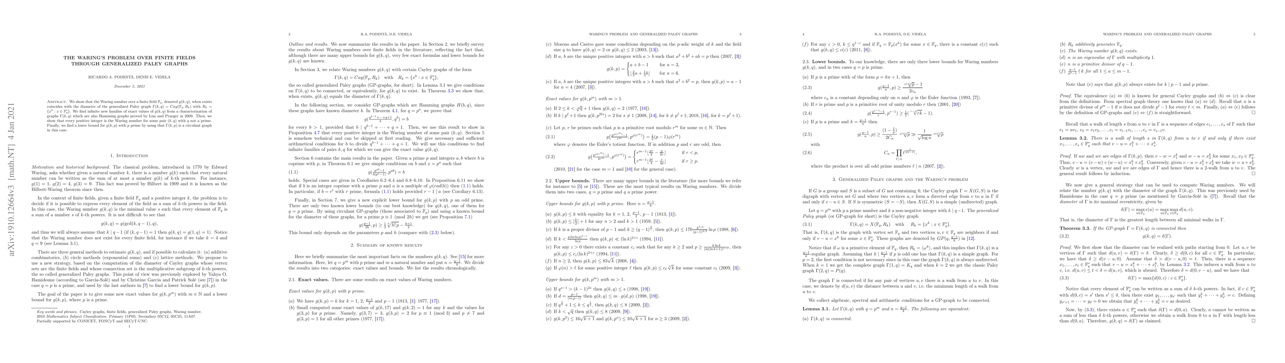 This paper establishes a connection between Waring's number over finite fields and the diameter of generalized Paley graphs, revealing new exact values and proving that every positive integer can be a Waring number for some non-prime field size. It also provides a lower bound for the Waring number in prime field cases using circulant graph properties.