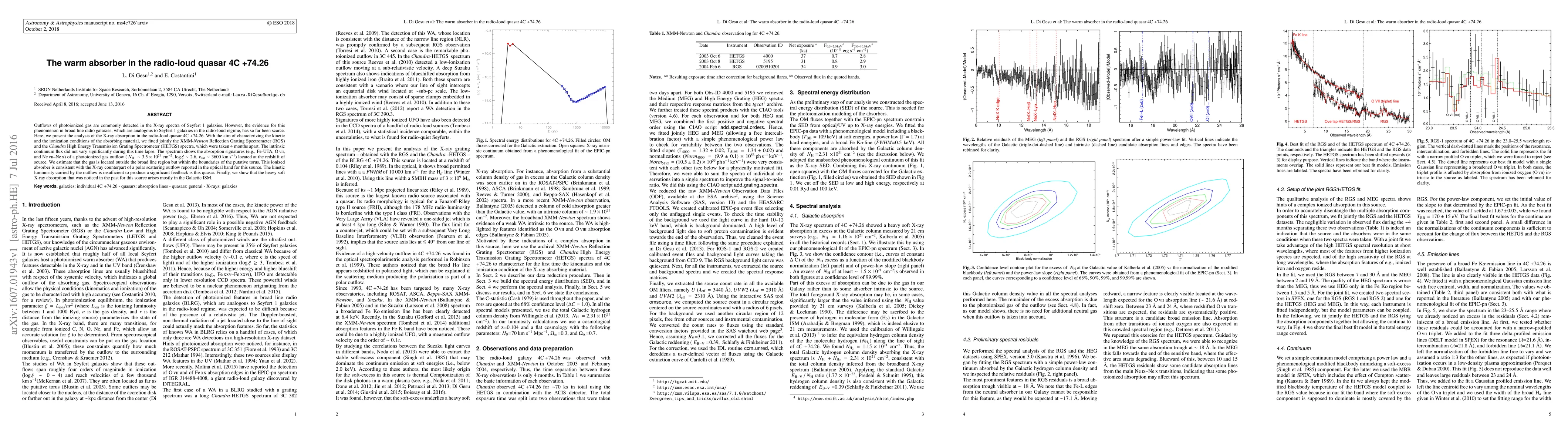This paper analyzes the X-ray absorption in the radio-loud quasar 4C +74.26, revealing evidence of a photoionized gas outflow with characteristics similar to those in Seyfert 1 galaxies. The outflow is located outside the broad line region but within the putative torus, suggesting a polar scattering outflow.