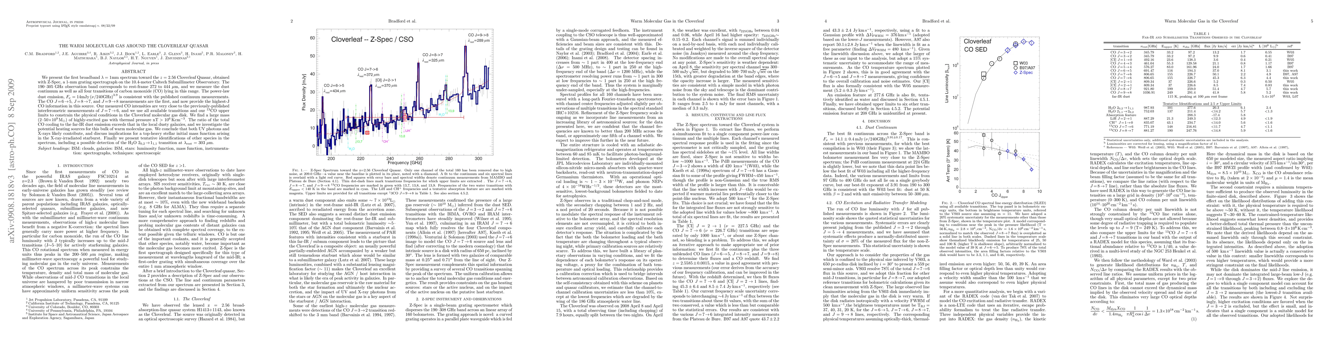 We present the first broadband lambda = 1 mm spectrum toward the z=2.56 Cloverleaf Quasar, obtained with Z-Spec, a 1-mm grating spectrograph on the 10.4-meter Caltech Submillimeter Observatory. The 190-305 GHz observation band corresponds to rest-frame 272 to 444 microns, and we measure the dust continuum as well as all four transitions of carbon monoxide (CO) lying in this range. The power-law dust emission, F_nu = 14 mJy (nu/240GHz)^3.9 is consistent with the published continuum measurements. The CO J=6->5, J=8->7, and J=9->8 measurements are the first, and now provide the highest-J CO information in this source. Our measured CO intensities are very close to the previously-published interferometric measurements of J=7->6, and we use all available transitions and our 13CO upper limits to constrain the physical conditions in the Cloverleaf molecular gas disk. We find a large mass (2-50x10^9 Msun) of highly-excited gas with thermal pressure nT > 10^6 Kcm^-3. The ratio of the total CO cooling to the far-IR dust emission exceeds that in the local dusty galaxies, and we investigate the potential heating sources for this bulk of warm molecular gas. We conclude that both UV photons and X-rays likely contribute, and discuss implications for a top-heavy stellar initial mass function arising in the X-ray-irradiated starburst. Finally we present tentative identifications of other species in the spectrum, including a possible detection of the H20 2_0,2->1_1,1 transition at lambda_rest = 303 microns.