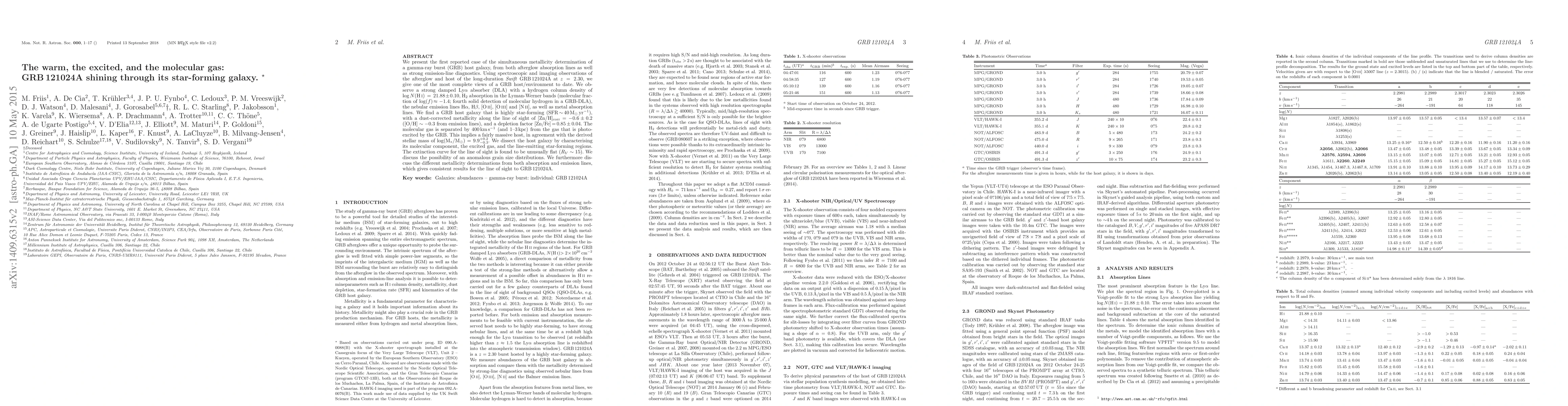 We present the first reported case of the simultaneous metallicity determination of a gamma-ray burst (GRB) host galaxy, from both afterglow absorption lines as well as strong emission-line diagnostics. Using spectroscopic and imaging observations of the afterglow and host of the long-duration Swift GRB121024A at z = 2.30, we give one of the most complete views of a GRB host/environment to date. We observe a strong damped Ly-alpha absorber (DLA) with a hydrogen column density of log N(HI) = 21.88 +/- 0.10, H2 absorption in the Lyman-Werner bands (molecular fraction of log(f)~ -1.4; fourth solid detection of molecular hydrogen in a GRB-DLA), the nebular emission lines H-alpha, H-beta, [O II], [O III] and [N II], as well as metal absorption lines. We find a GRB host galaxy that is highly star-forming (SFR ~ 40 solar masses/yr ), with a dust-corrected metallicity along the line of sight of [Zn/H]corr = -0.6 +/- 0.2 ([O/H] ~ -0.3 from emission lines), and a depletion factor [Zn/Fe] = 0.85 +/- 0.04. The molecular gas is separated by 400 km/s (and 1-3 kpc) from the gas that is photoexcited by the GRB. This implies a fairly massive host, in agreement with the derived stellar mass of log(M/M_solar ) = 9.9+/- 0.2. We dissect the host galaxy by characterising its molecular component, the excited gas, and the line-emitting star-forming regions. The extinction curve for the line of sight is found to be unusually flat (Rv ~15). We discuss the possibility of an anomalous grain size distributions. We furthermore discuss the different metallicity determinations from both absorption and emission lines, which gives consistent results for the line of sight to GRB 121024A.