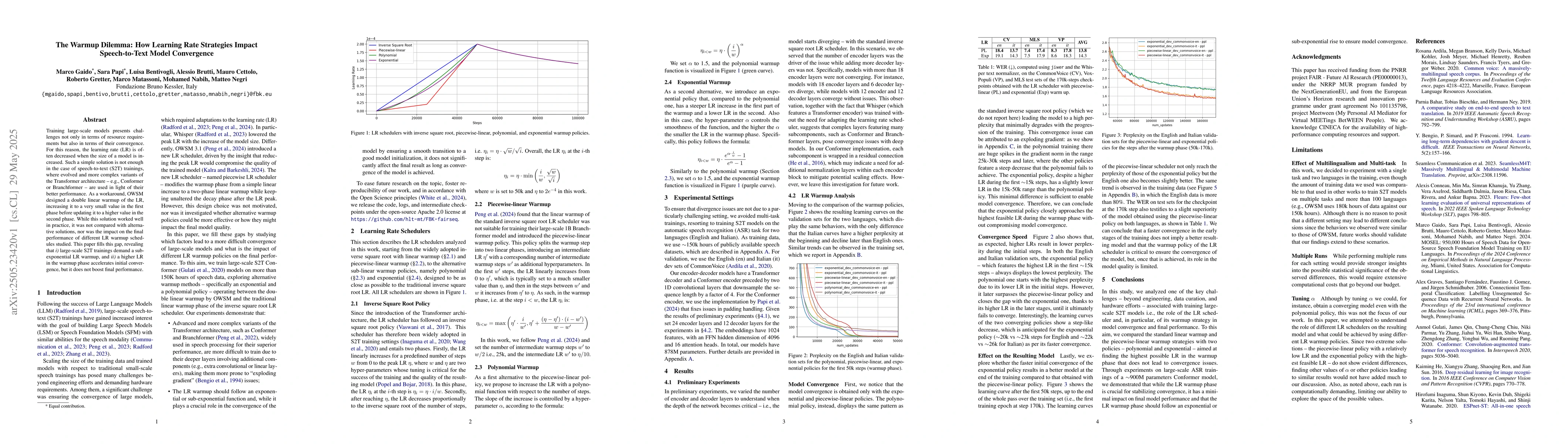 Research reveals that large-scale speech-to-text model trainings require a sub-exponential learning rate (LR) warmup to achieve convergence, while a higher LR in the warmup phase initially accelerates but does not boost final performance.