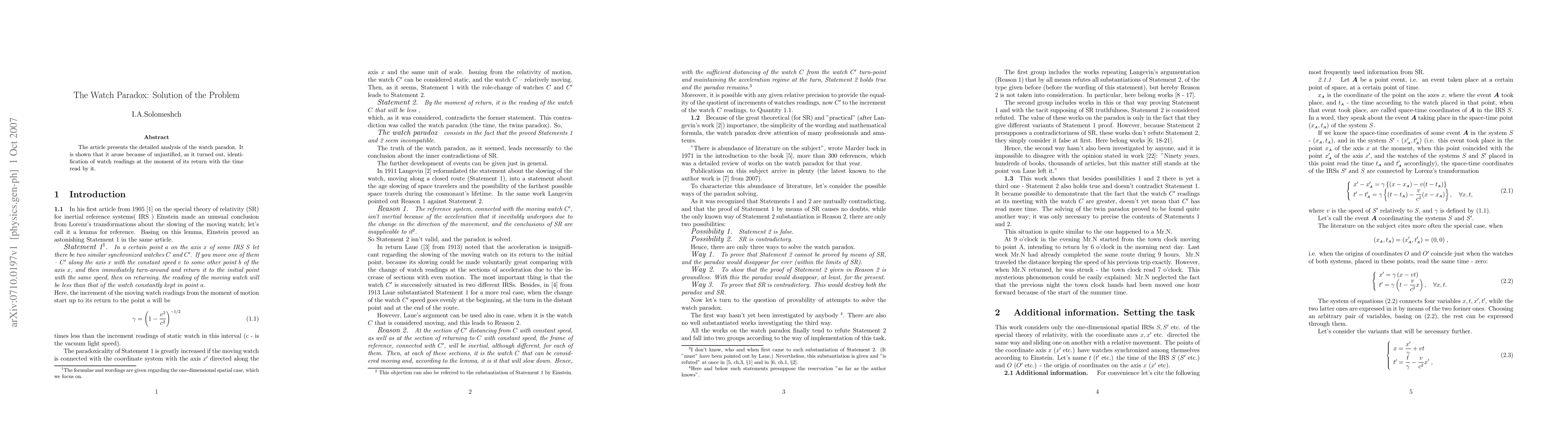 The research paper addresses the watch paradox, concluding it stemmed from incorrectly associating the watch's return-time reading with the elapsed time. It emphasizes the importance of distinguishing between these two distinct readings.