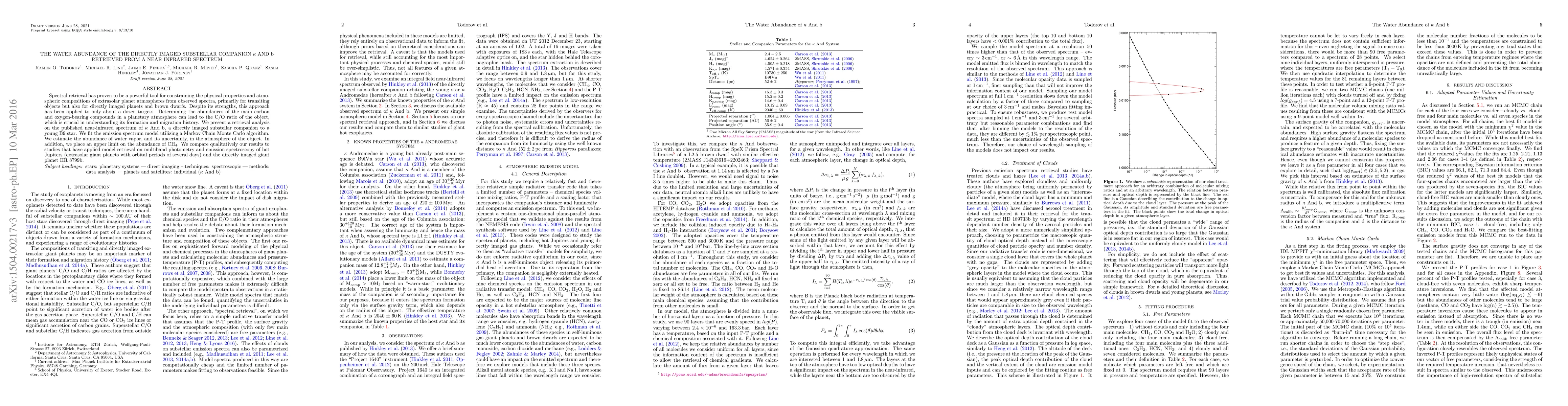 Spectral retrieval has proven to be a powerful tool for constraining the physical properties and atmospheric compositions of extrasolar planet atmospheres from observed spectra, primarily for transiting objects but also for directly imaged planets and brown dwarfs. Despite its strengths, this approach has been applied to only about a dozen targets. Determining the abundances of the main carbon and oxygen-bearing compounds in a planetary atmosphere can lead to the C/O ratio of the object, which is crucial in understanding its formation and migration history. We present a retrieval analysis on the published near-infrared spectrum of {\kappa} And b, a directly imaged substellar companion to a young B9 star. We fit the emission spectrum model utilizing a Markov Chain Monte Carlo algorithm. We estimate the abundance of water vapor, and its uncertainty, in the atmosphere of the object. In addition, we place an upper limit on the abundance of CH$_4$. We compare qualitatively our results to studies that have applied model retrieval on multiband photometry and emission spectroscopy of hot Jupiters (extrasolar giant planets with orbital periods of several days) and the directly imaged giant planet HR 8799b.