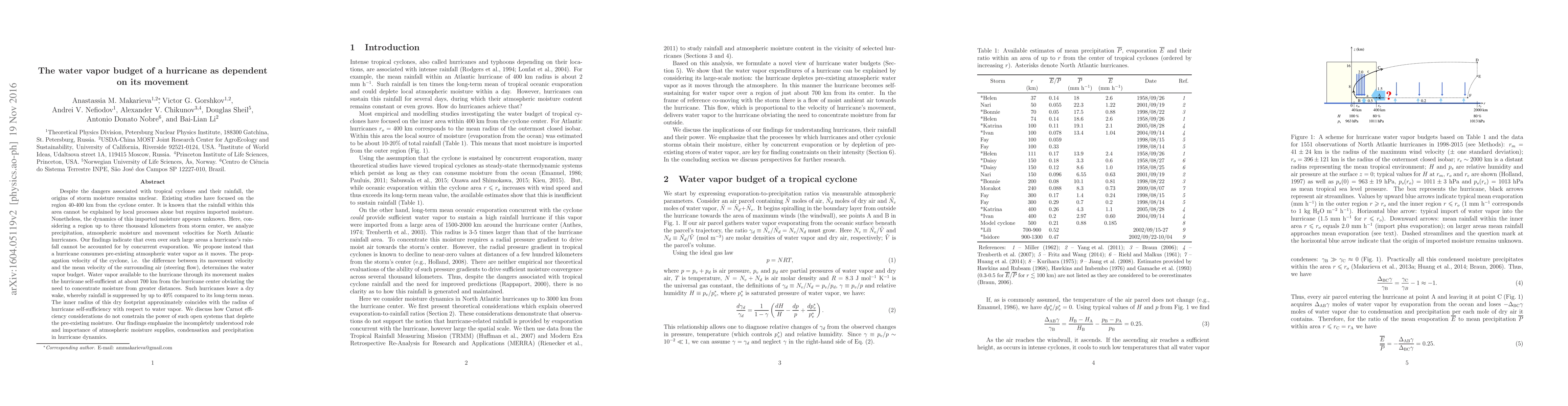 This paper investigates the water budget of hurricanes, finding that their rainfall is sustained by pre-existing atmospheric water vapor rather than local evaporation. The cyclone's movement velocity relative to the surrounding air determines the availability of water vapor, leading to a self-sufficient radius of about 700 km from the center, where hurricanes leave a dry wake reducing rainfall by up to 40%.