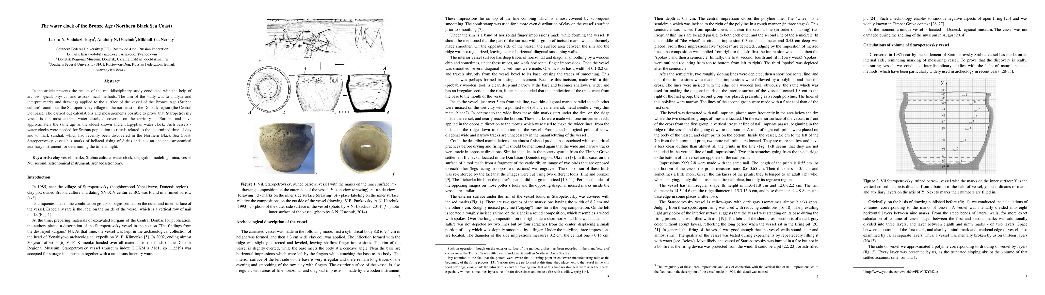 In the article presents the results of the multidisciplinary study conducted with the help of archaeological, physical and astronomical methods. The aim of the study was to analyze and interpret marks and drawings applied to the surface of the vessel of the Bronze Age (Srubna culture) found near the Staropetrovsky village (Donetsk region, Ukraine) near the border between the Donetsk and Lugansk regions. The carried out calculations and measurements possible to prove that staropetrovsky vessel is the most ancient water clock, discovered on the territory of Europe, and have approximately the same age as the oldest known ancient Egyptian water clock. Such vessels - water clocks were needed for Srubna population to mark sundial, which had recently been discovered in the Northern Black Sea Coast. Based on the analysis of marks on the outside of the vessel, it was revealed that Staropetrovsky vessel is unique ancient complex device for measuring time and at the same time using a water clock, and with the help of a sundial, allows to monitor of the uneven apparent motion of the Sun long before the existing written evidence about such monitoring. Series of marks on the outer surface of the vessel and on its corolla was associated with the star Sirius and its heliacal rising. Given in this paper the results of astronomical calculations allow to state that astronomical beginning of the year recorded since the heliacal rising of Sirius at the Srubna population of the Northern Black Sea Coast. Keywords: archaeoastronomy, modeling, Srubna culture, vessel, marks, water clock, sundial, equation of time, Sirius, heliacal rising.