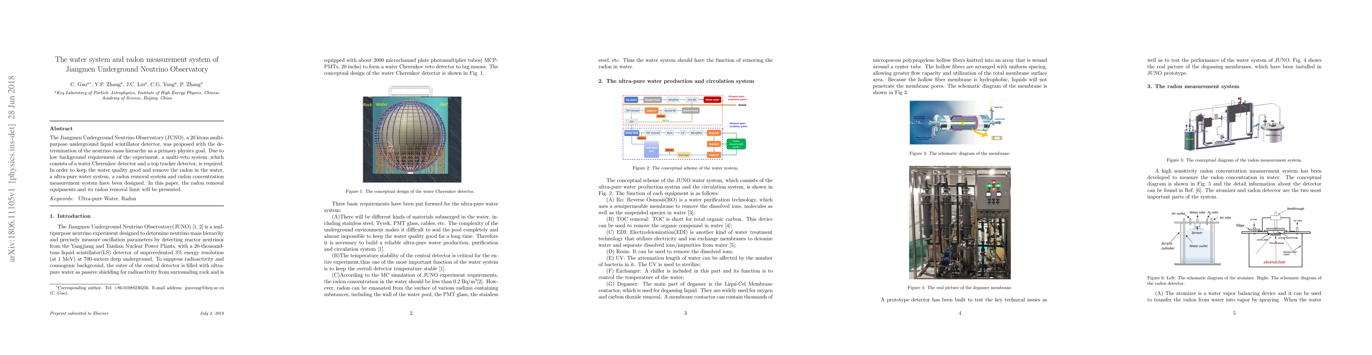 This paper discusses the radon removal and measurement systems designed for the Jiangmen Underground Neutrino Observatory (JUNO), focusing on maintaining ultra-pure water quality and achieving low background conditions necessary for the experiment's primary physics goal. The study presents the radon removal equipment and its effectiveness in limiting radon concentrations.