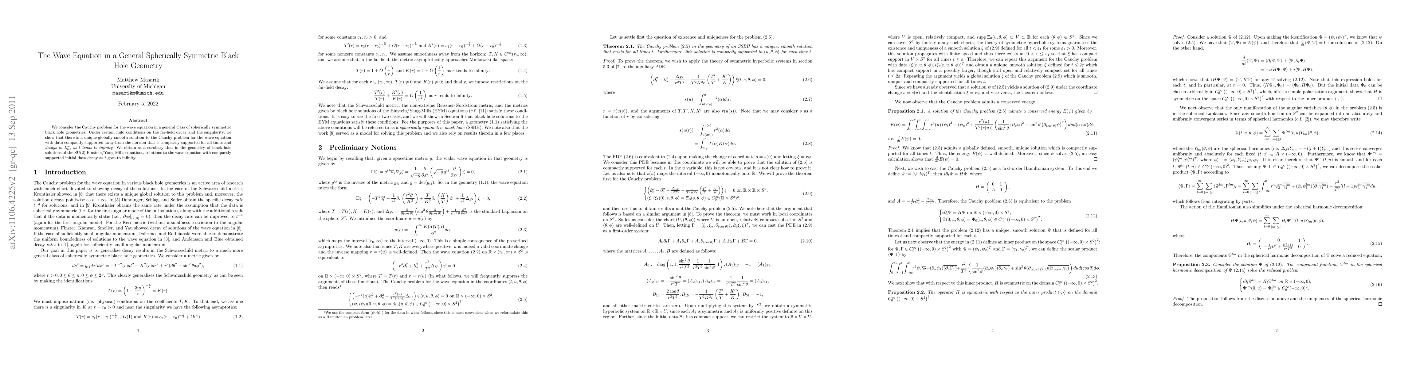 We consider the Cauchy problem for the wave equation in a general class of spherically symmetric black hole geometries. Under certain mild conditions on the far-field decay and the singularity, we show that there is a unique globally smooth solution to the Cauchy problem for the wave equation with data compactly supported away from the horizon that is compactly supported for all times and \emph{decays in $L^{\infty}_{\text{loc}}$ as $t$ tends to infinity}. We obtain as a corollary that in the geometry of black hole solutions of the SU(2) Einstein/Yang-Mills equations, solutions to the wave equation with compactly supported initial data decay as $t$ goes to infinity.