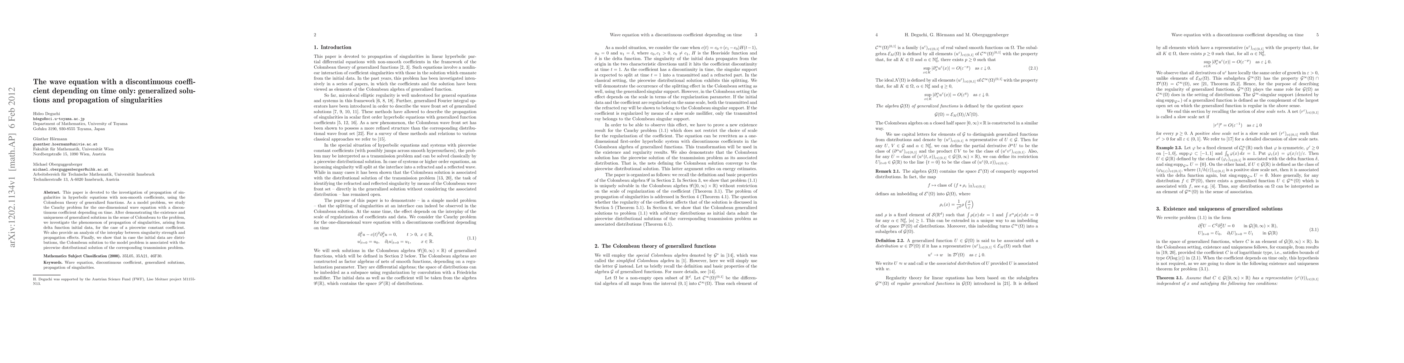 This paper investigates the propagation of singularities in hyperbolic equations with discontinuous coefficients using Colombeau generalized functions, focusing on the one-dimensional wave equation. It demonstrates the existence and uniqueness of generalized solutions and analyzes how singularities propagate, particularly when initial data are delta functions.
