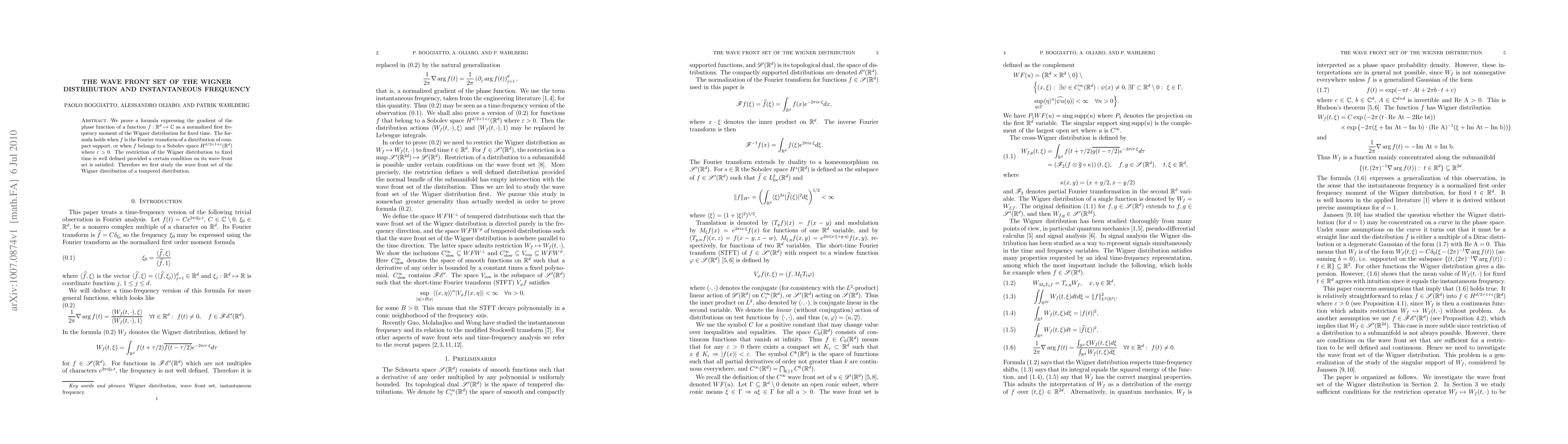 This paper establishes a formula linking the gradient of the phase function of a function $f$ to the Wigner distribution's first frequency moment at fixed time. It also investigates the wave front set of the Wigner distribution to ensure its restriction to fixed time is well-defined.