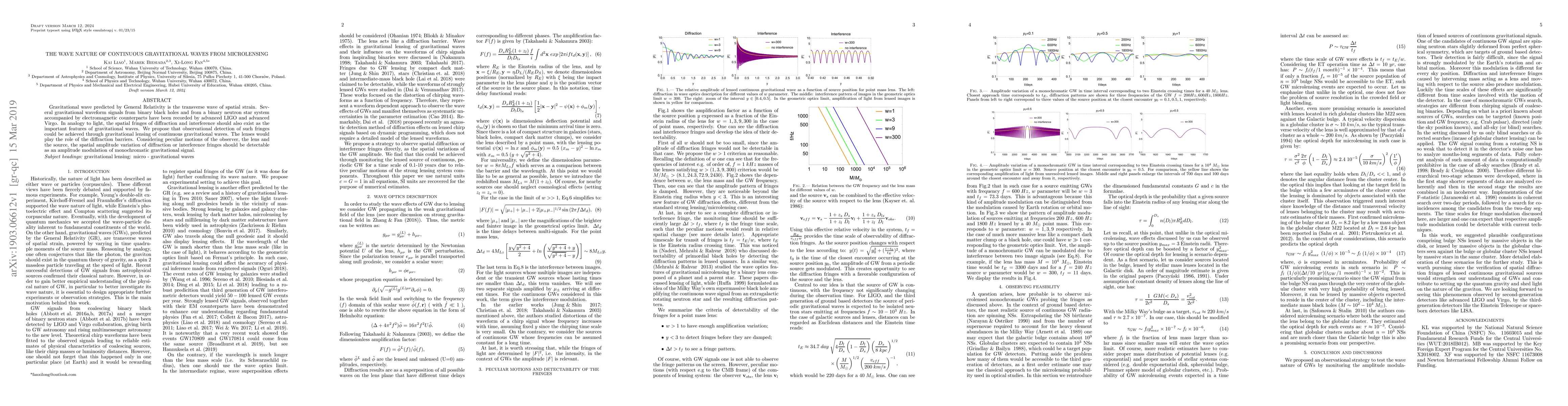 This paper proposes that continuous gravitational waves from sources like binary black holes can exhibit diffraction and interference patterns detectable through gravitational lensing, analogous to light. The expected spatial amplitude variations due to these patterns could be observed as modulations in the gravitational wave signal.