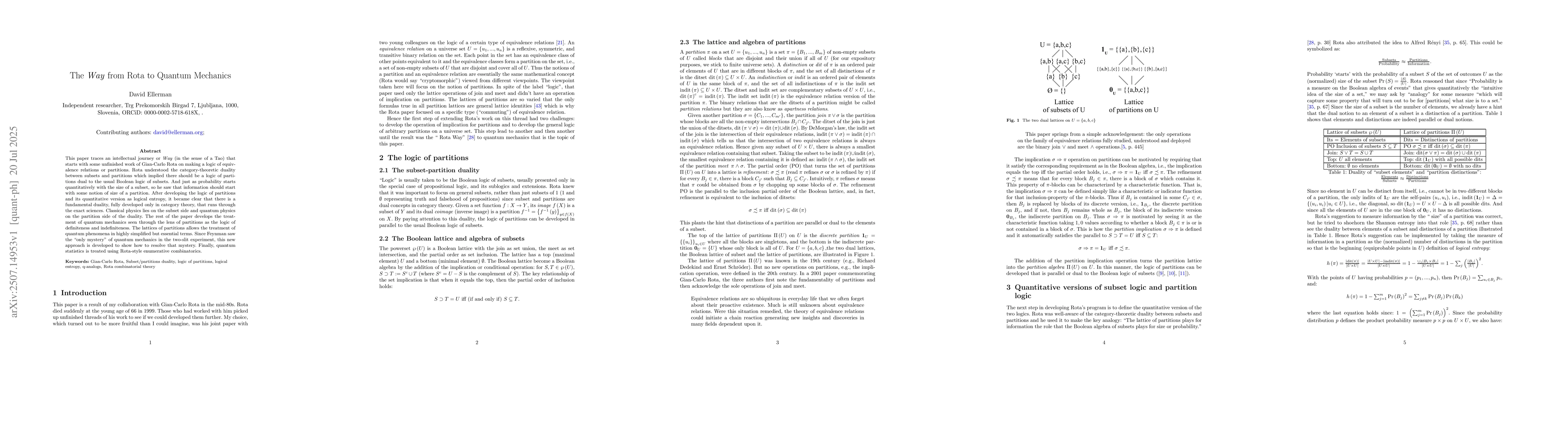 This paper traces an intellectual journey or \textit{Way} (in the sense of a Tao) that starts with some unfinished work of Gian-Carlo Rota on making a logic of equivalence relations or partitions. Rota understood the category-theoretic duality between subsets and partitions which implied there should be a logic of partitions dual to the usual Boolean logic of subsets.And just as probability starts quantitatively with the size of a subset, so he saw that information should start with some notion of size of a partition. After developing the logic of partitions and its quantitative version as logical entropy, it became clear that there is a fundamental duality, fully developed only in category theory, that runs through the exact sciences. Classical physics lies on the subset side and quantum physics on the partition side of the duality. The rest of the paper develops the treatment of quantum mechanics seen through the lens of partitions as the logic of definiteness and indefiniteness. The lattices of partitions allows the treatment of quantum phenomena in highly simplified but essential terms. Since Feynman saw the``only mystery'' of quantum mechanics in the two-slit experiment, this new approach is developed to show how to resolve that mystery. Finally, quantum statistics is treated using Rota-style enumerative combinatorics.