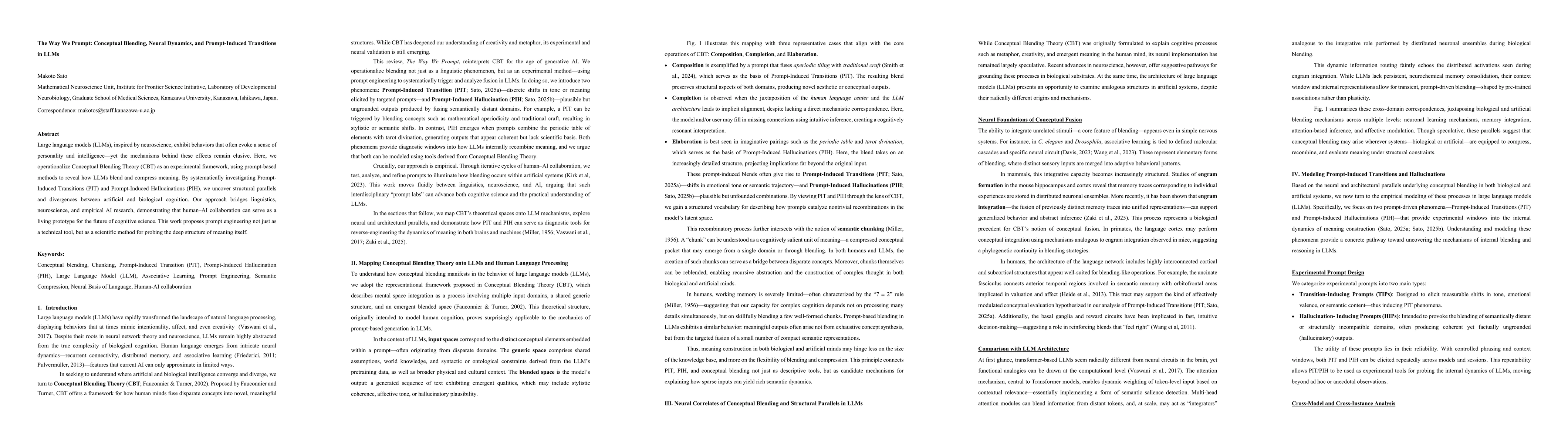 Large language models (LLMs), inspired by neuroscience, exhibit behaviors that often evoke a sense of personality and intelligence-yet the mechanisms behind these effects remain elusive. Here, we operationalize Conceptual Blending Theory (CBT) as an experimental framework, using prompt-based methods to reveal how LLMs blend and compress meaning. By systematically investigating Prompt-Induced Transitions (PIT) and Prompt-Induced Hallucinations (PIH), we uncover structural parallels and divergences between artificial and biological cognition. Our approach bridges linguistics, neuroscience, and empirical AI research, demonstrating that human-AI collaboration can serve as a living prototype for the future of cognitive science. This work proposes prompt engineering not just as a technical tool, but as a scientific method for probing the deep structure of meaning itself.