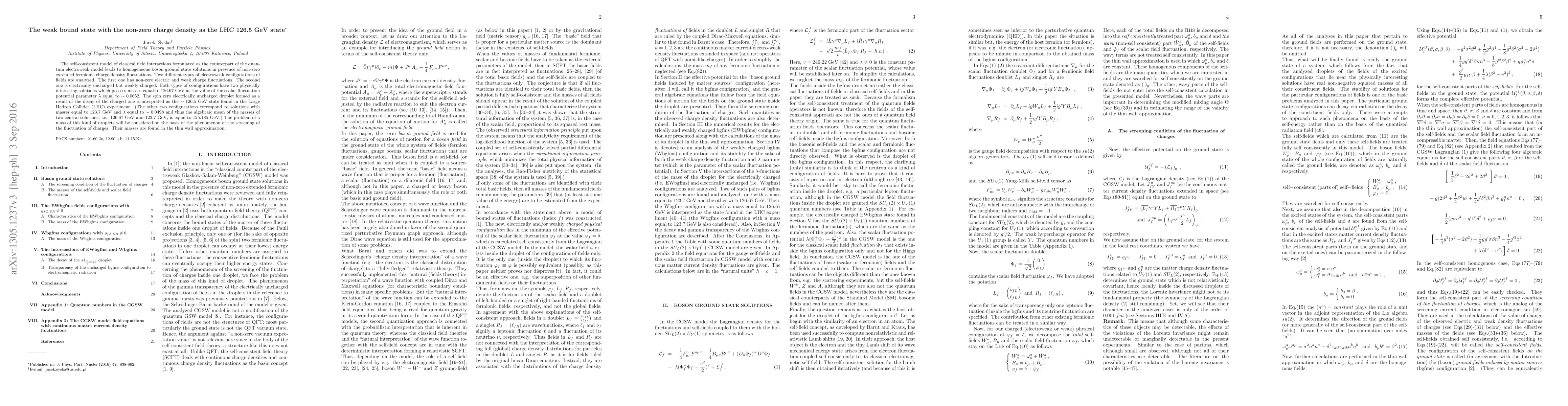 The self-consistent model of classical field interactions formulated as the counterpart of the quantum electroweak model leads to homogeneous boson ground state solutions in presence of non-zero extended fermionic charge density fluctuations. Two different types of electroweak configurations of fields are analyzed. The first one has non-zero electric and weak charge fluctuations. The second one is electrically uncharged but weakly charged. Both types of configurations have two physically interesting solutions which possess masses equal to 126.67 GeV at the value of the scalar fluctuation potential parameter $\lambda$ equal to ~ 0.0652. The spin zero electrically uncharged droplet formed as a result of the decay of the charged one is interpreted as the ~ 126.5 GeV state found in the Large Hadron Collider (LHC) experiment. (The other two configurations correspond to solutions with masses equal to 123.7 GeV and $\lambda$ equal to ~ 0.0498 and thus the algebraic mean of the masses of two central solutions, i.e., 126.67 GeV and 123.7 GeV, is equal to 125.185 GeV.) The problem of a mass of this kind of droplets will be considered on the basis of the phenomenon of the screening of the fluctuation of charges. Their masses are found in the thin wall approximation.